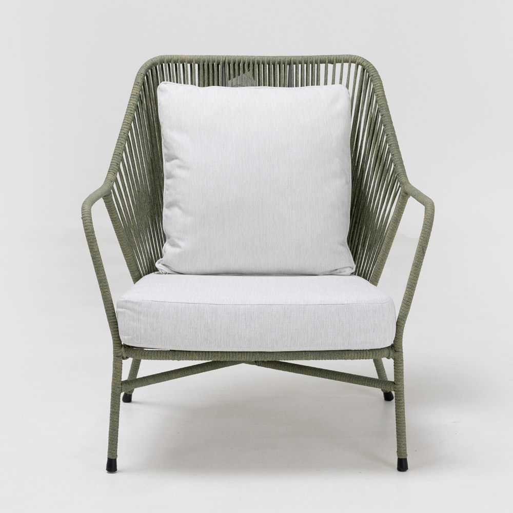 Toto zahradní křeslo je oázou odpočinku, ideální pro vychutnání klidu venkovních prostor. Jeho design je moderní, lehká konstrukce z tkaného lana vytváří hru průhlednosti a stínů, která dodá vaší zahradě nebo terase hloubku a vizuální zajímavost.