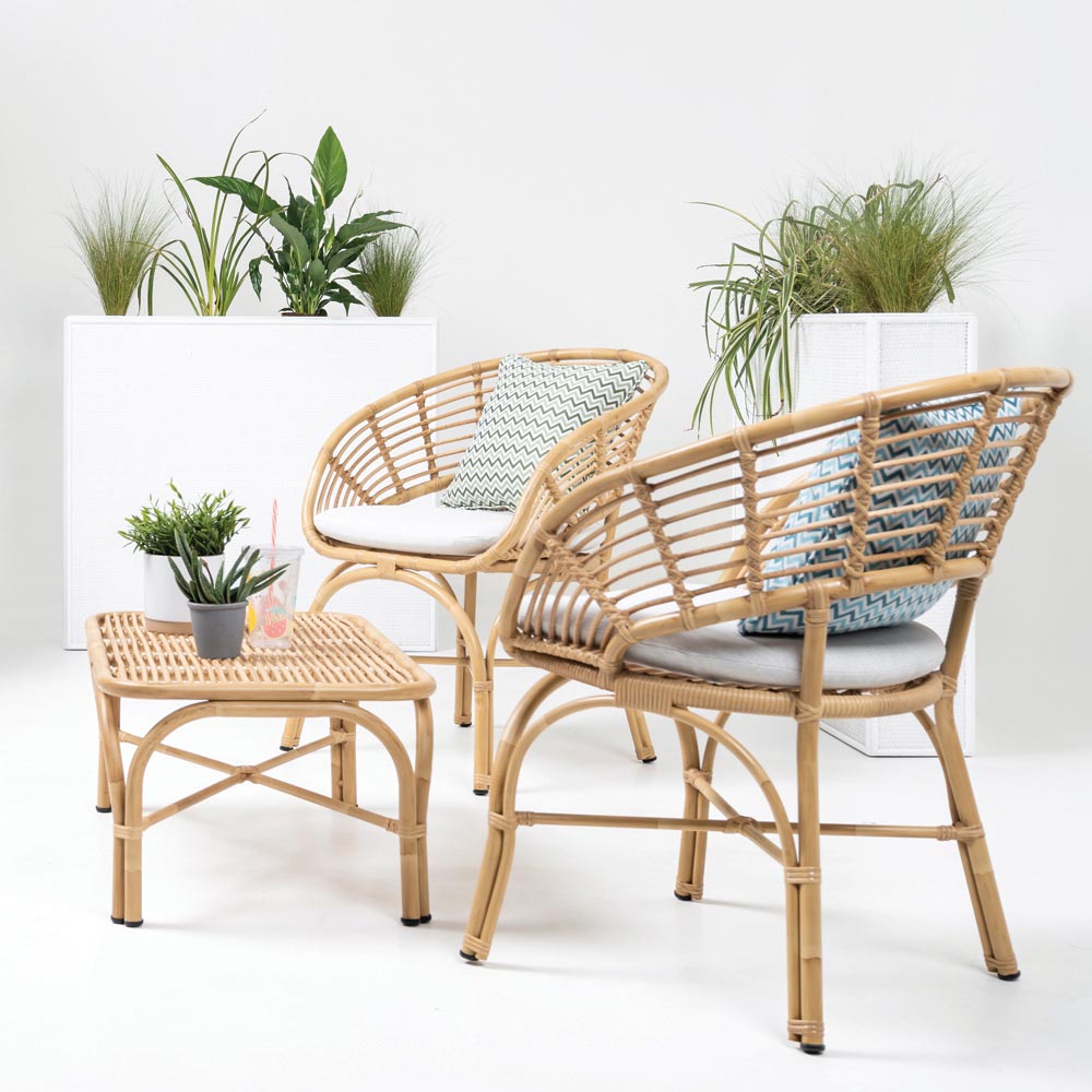 Polyratanová vlákna jsou nejvyšší kvality dostupné na trhu (VIRO/REHAU). Jsou vyrobena ze speciálního vysokohustotního polyethylenu (HDPE) a jsou certifikována tak, aby odolávala atmosférickým vlivům a dokonce i extrémním klimatickým faktorům, aniž by došlo k výraznému poškození struktury a byla zachována stálobarevnost. V případě potřeby doporučujeme k čištění těchto vláken používat utěrky z mikrovlákna, neutrální čisticí prostředky a teplou vodu.