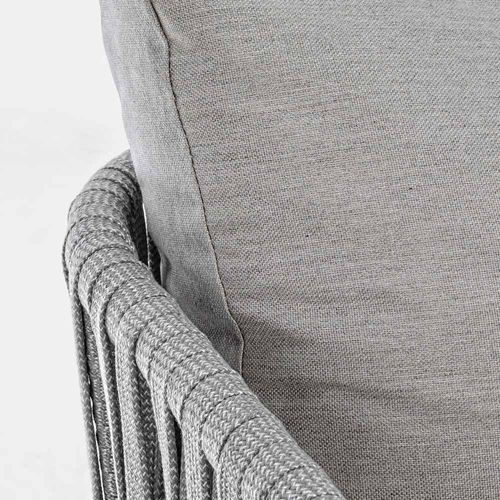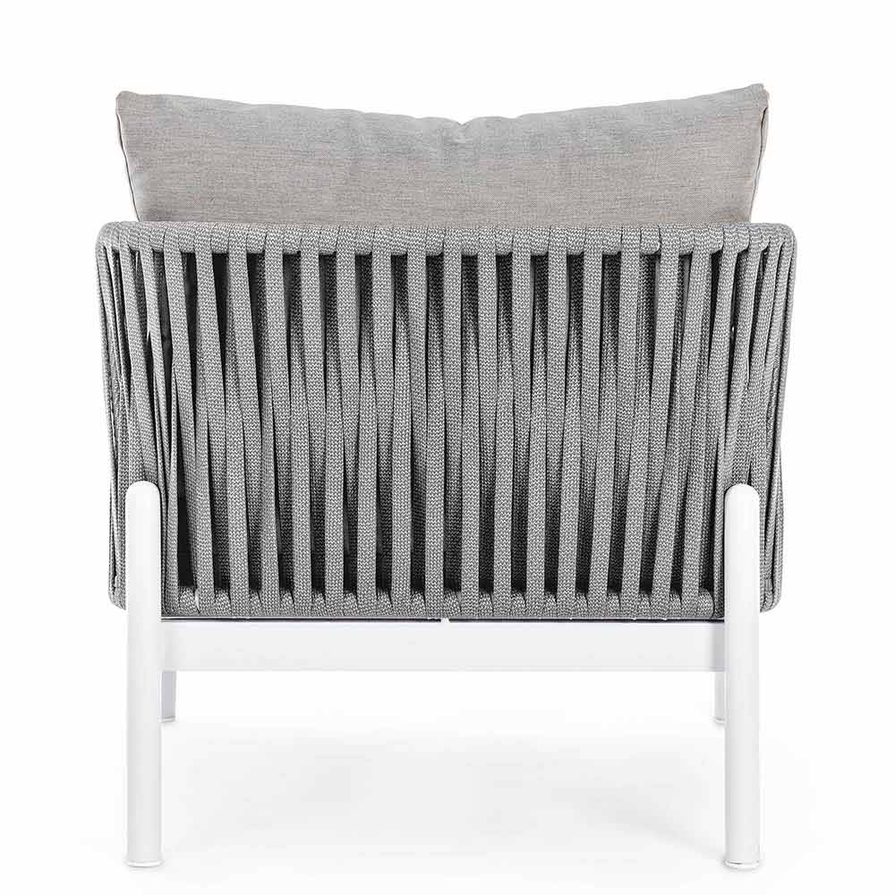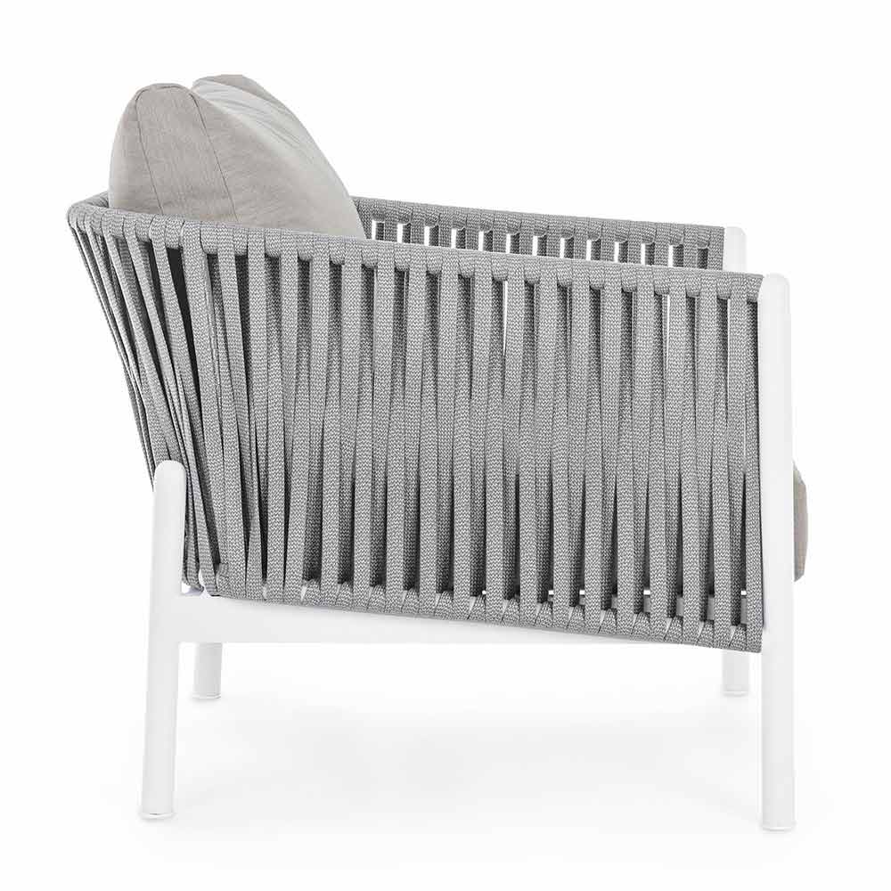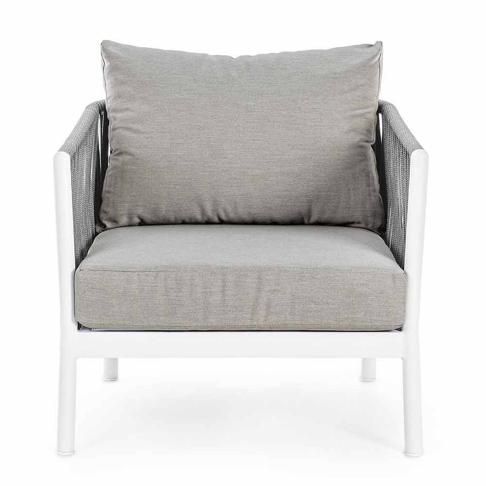 Venkovní designové křeslo s bílou hliníkovou strukturou a odnímatelnými polštáři.