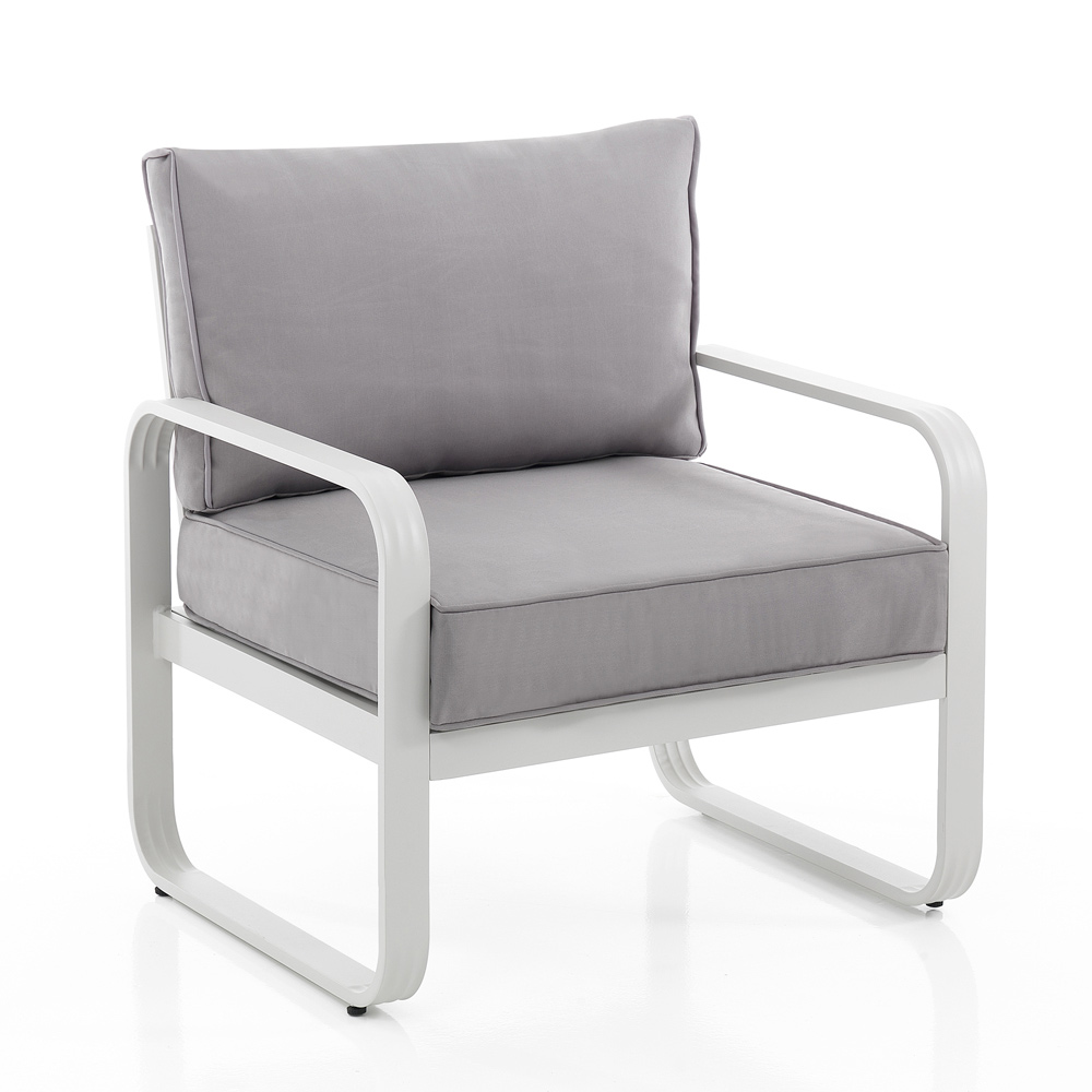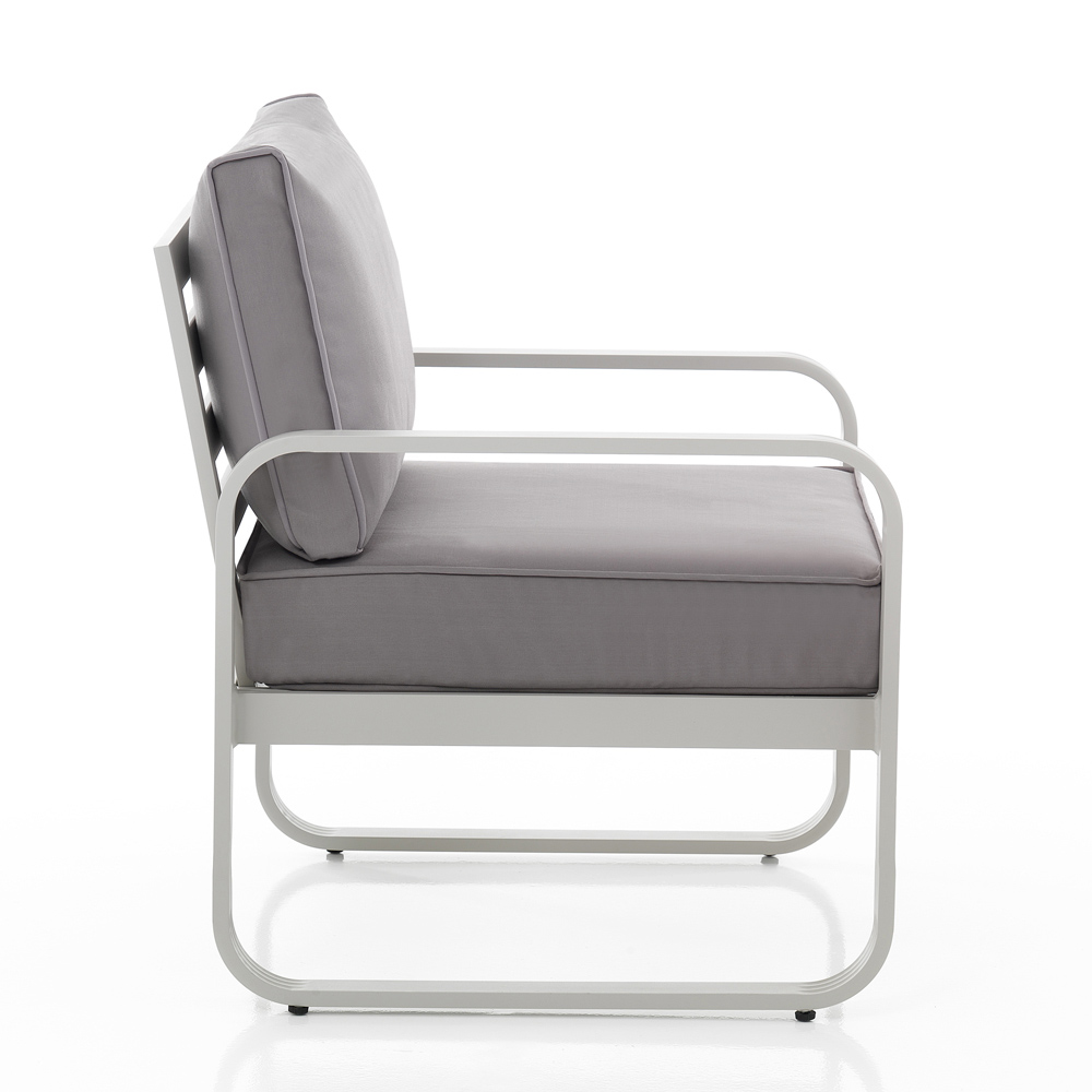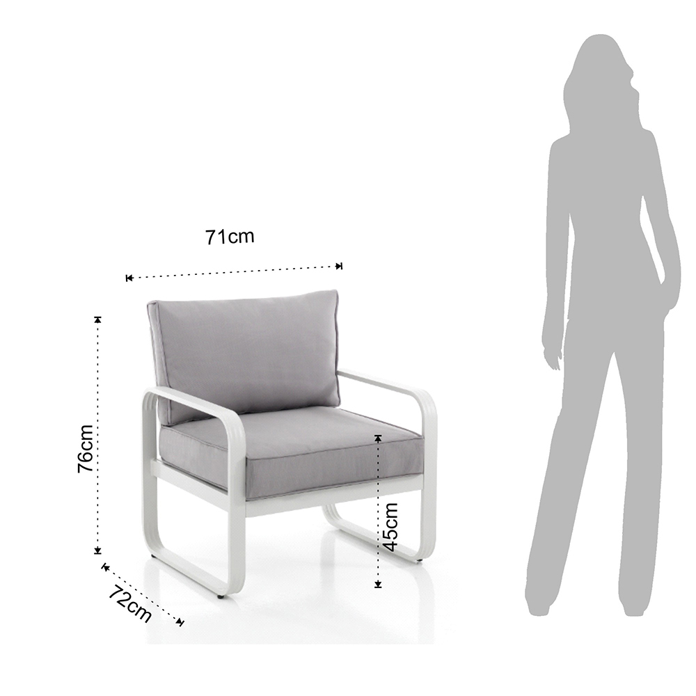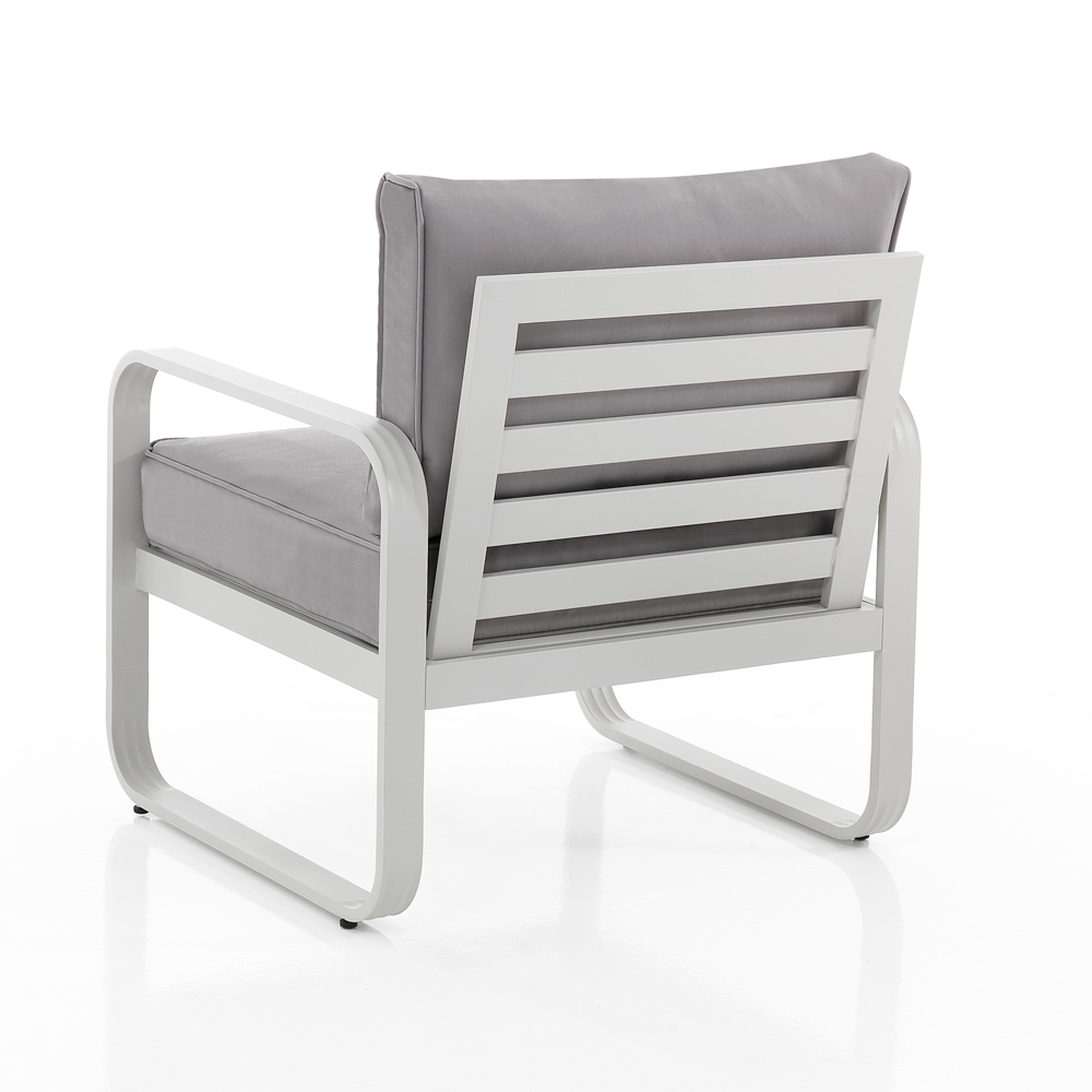 Toto křeslo je symbolem minimalistického pohodlí pro venkovní prostory . Jeho čisté linie a hliníková struktura nabízejí moderní a podmanivou estetiku, která se přizpůsobí s všestranností jak moderním zahradám, tak terasám v klasičtějším stylu.