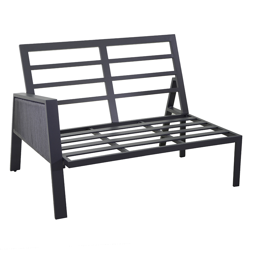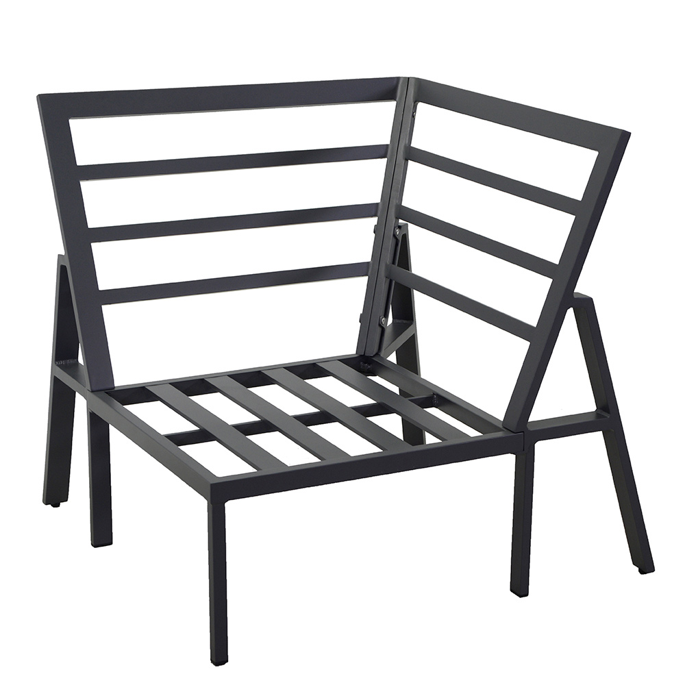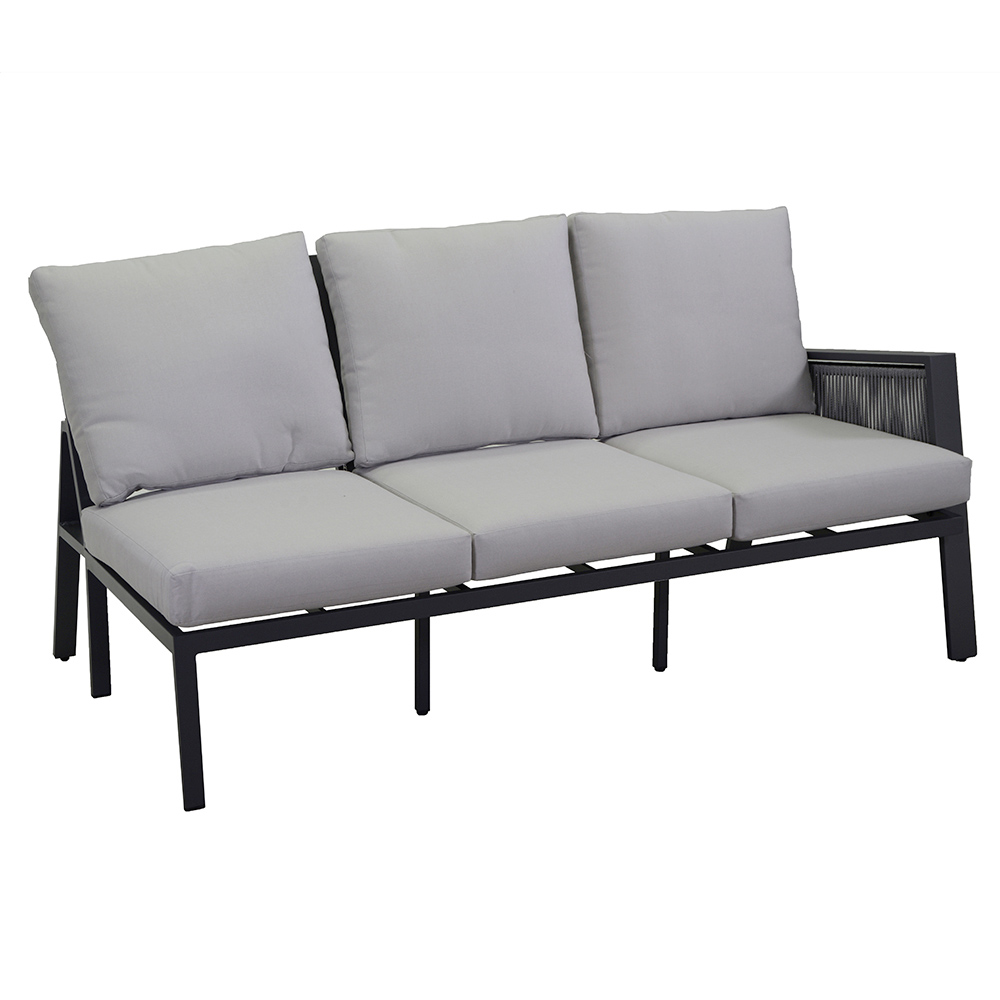 1 pohovky (jedna 2místná sedačka, jedna rohová sedačka, jedna 3místná sedačka): hliníkový antikorozní rám antracitové barvy, světle šedé textilenové šňůry a světle šedé vodoodpudivé 100% olefinové polštáře, snímatelné potahy.