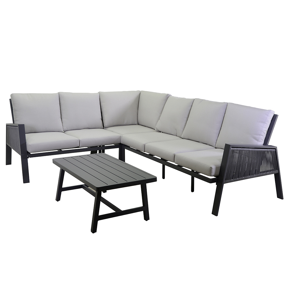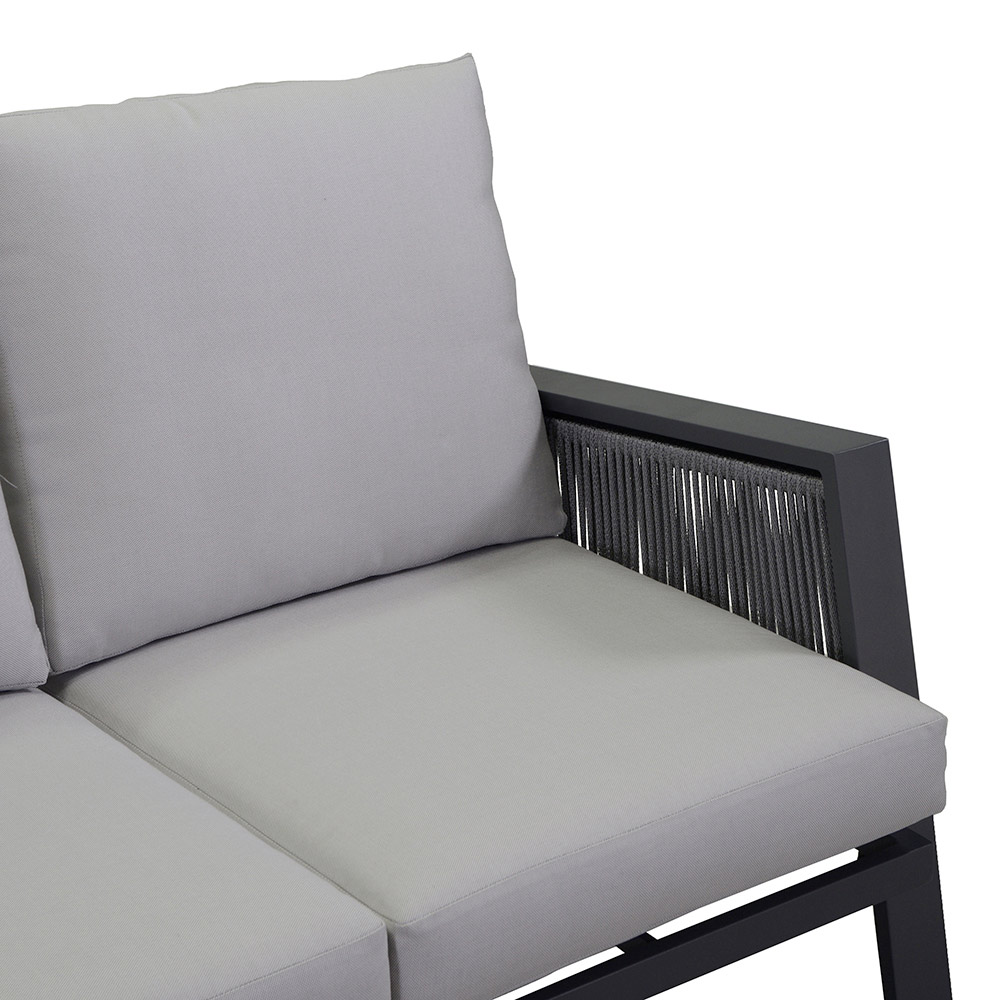 Tato elegantní zahradní lounge souprava je ideální pro ty, kteří hledají rafinovaný a pohodlný venkovní prostor. Díky hliníkovému rámu odolnému proti korozi v antracitové barvě nabízí tato souprava trvanlivost a styl a snadno odolává přírodním vlivům. světle šedé textilénové provazy jí dodávají moderní a vzdušný design, který je ideální pro vytvoření příjemné atmosféry na vaší zahradě nebo terase.