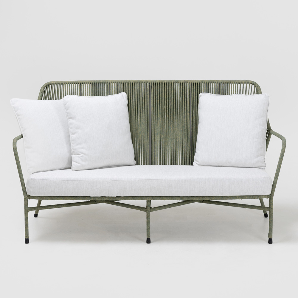 Pouštní směs barvy rámu harmonicky ladí s přírodním prostředím, zatímco bílé polštáře poskytují jemný a příjemný kontrast. Pohovka je vybavena sedákem a opěradlem s polstrovanými polštáři pro maximální pohodlí, což vám umožní plně relaxovat a zároveň se ponořit do klidu vašeho venkovního prostoru.