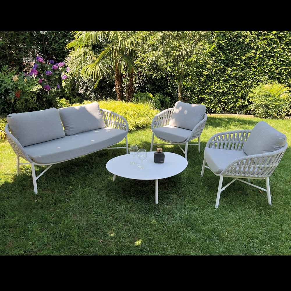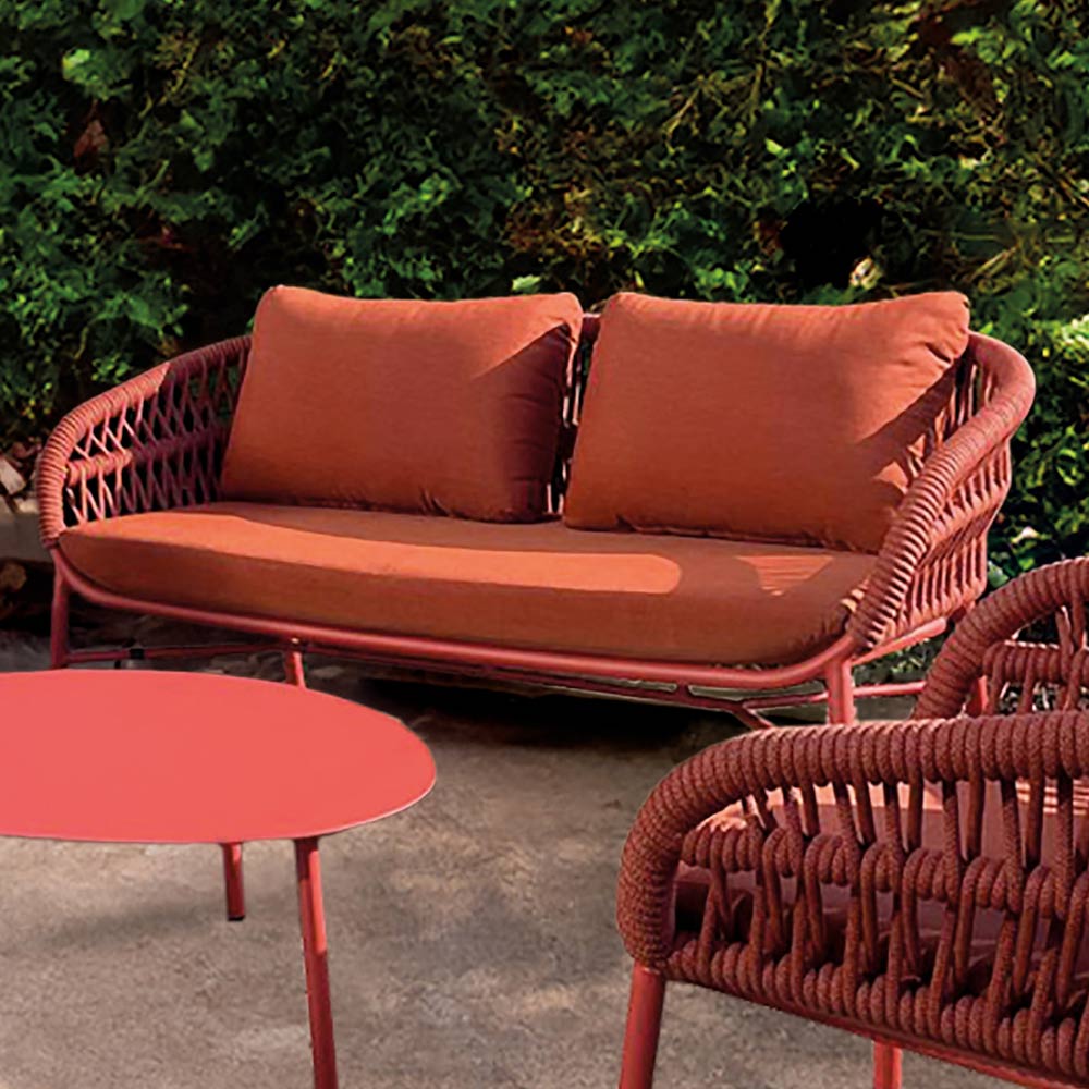 Tato zahradní pohovka je dokonalým příkladem příjemného designu a řemeslné vytříbenosti , ideální pro vytvoření obývacího koutu věnovaného relaxaci a stylu . Lakovaná hliníková konstrukce, lehká, ale odolná, elegantně podporuje rafinovanou vazbu polyesterového lana , která dodává sedadlu pohyb a osobitost.
