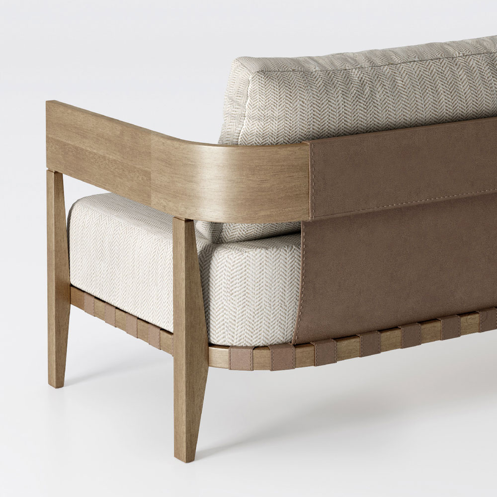 strukturou zvětralého teakového dřeva. Pohovka je v konstrukci sedáku a v opěradle zdobena