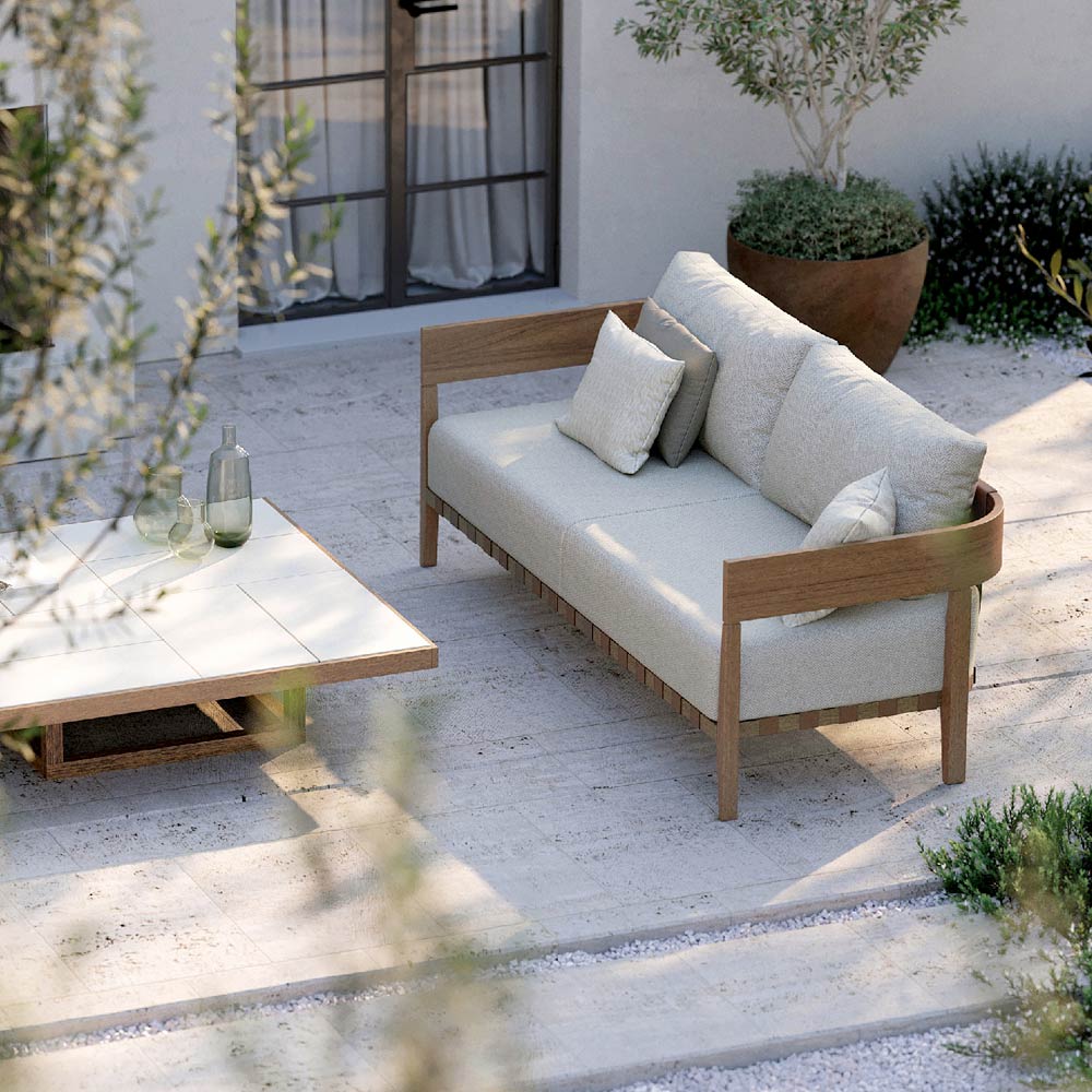Zahradní pohovka z teakového dřeva s polstrovaným sedákem a opěradlem Made in Italy