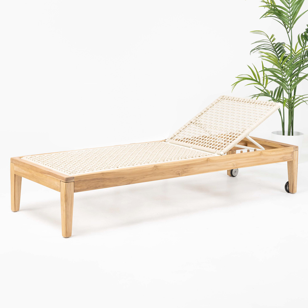 Venkovní lehátko z teakového dřeva a provazového výpletu.