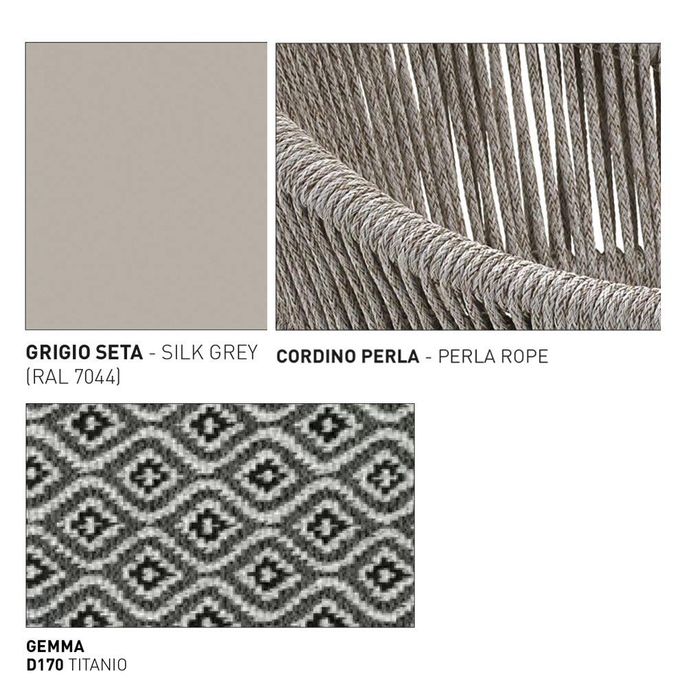 Zahradní puf skládající se z práškově lakovaného hliníkového rámu s hedvábně šedým povrchem, ručně tkaného vlákna s perleťovým povrchem a sedáku s polstrováním . Nábytek pro venkovní i vnitřní prostory schopný dotvořit komfort a styl okolního prostředí pro příjemný výsledek a současný estetický vzhled .