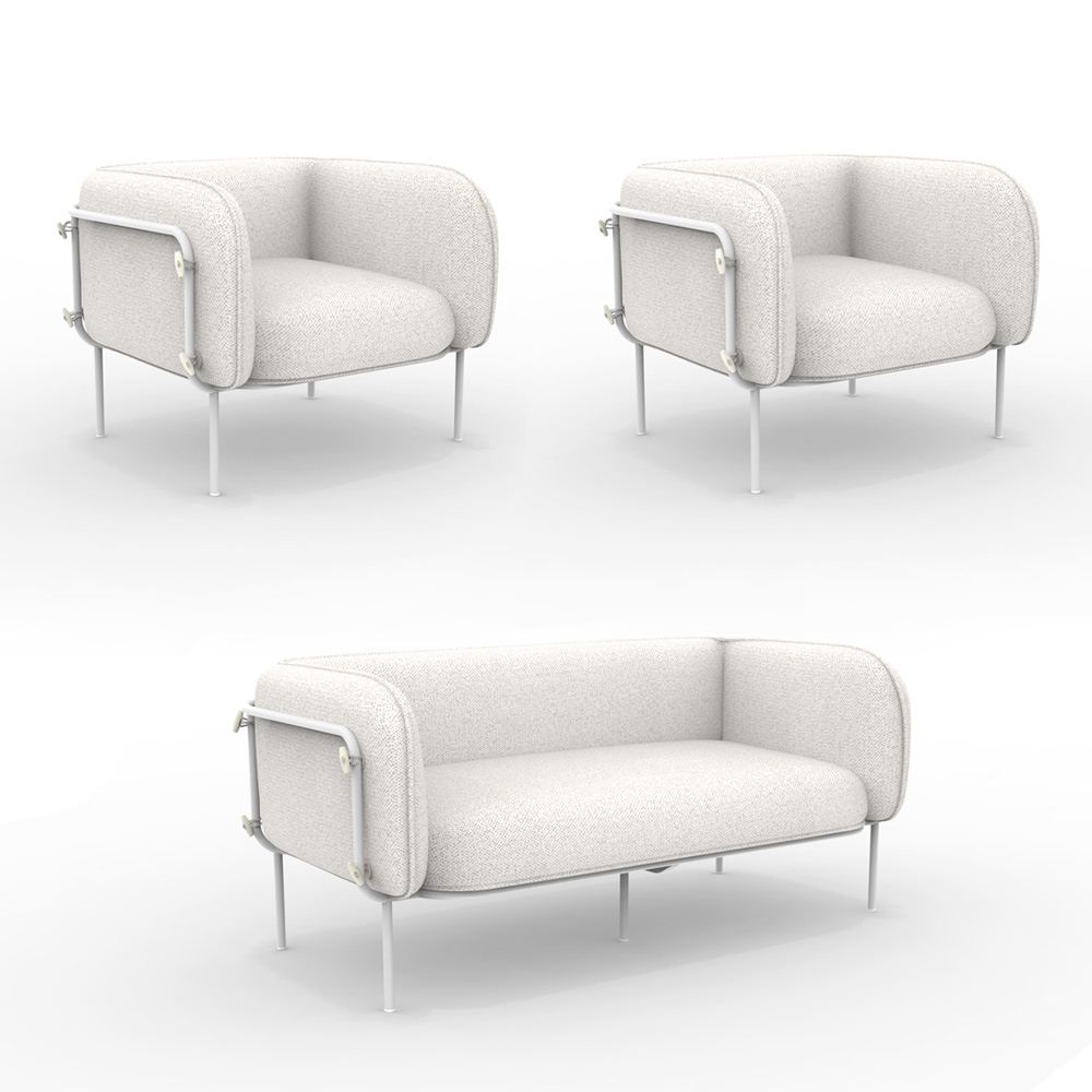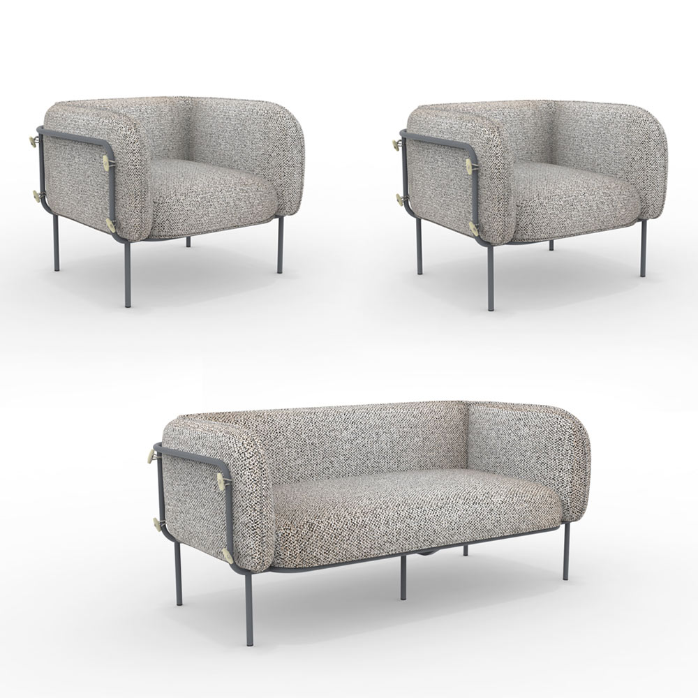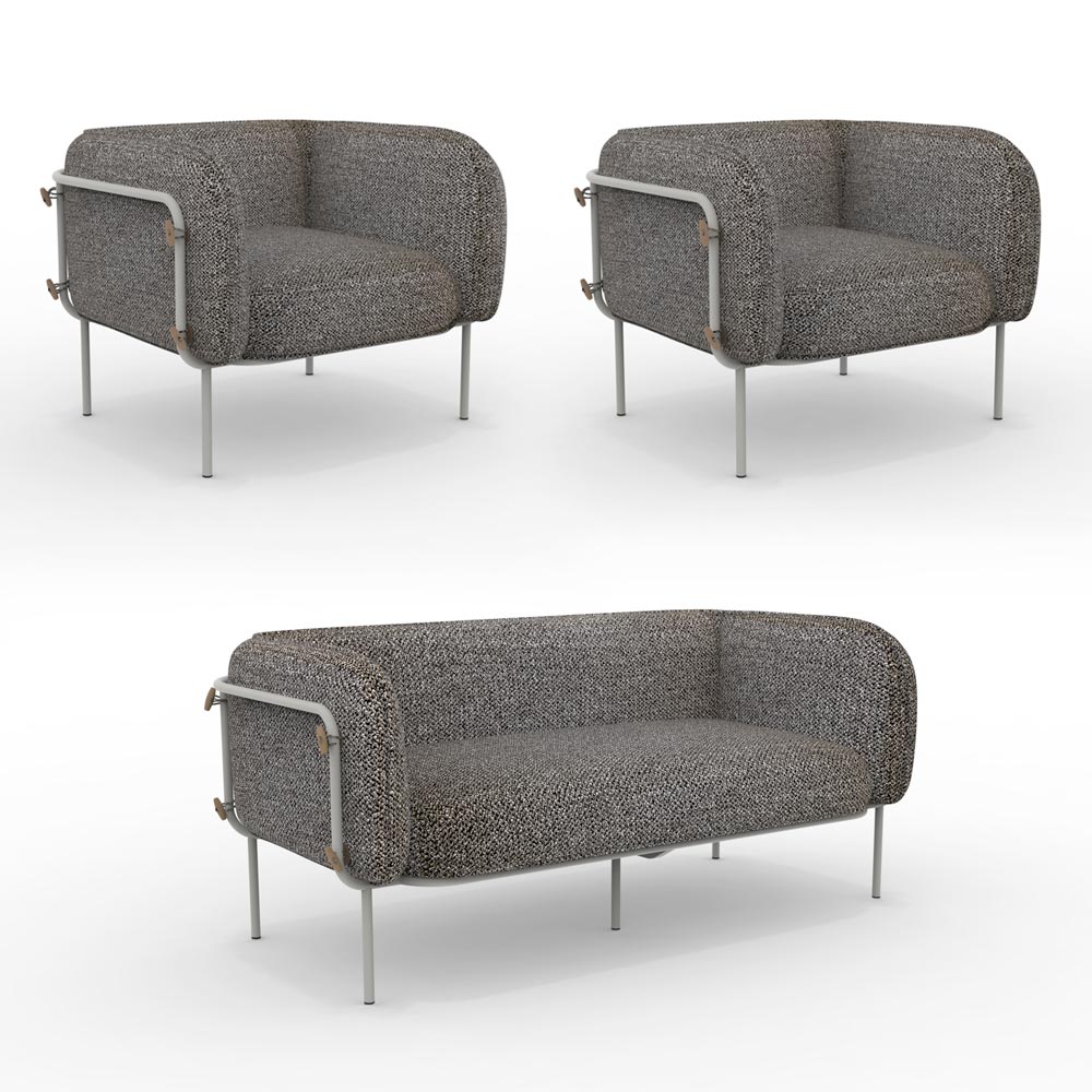 2 nízkých křesel a 1 dvoumístné pohovky , vyrobená z