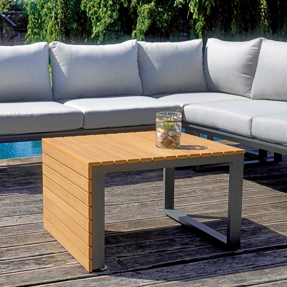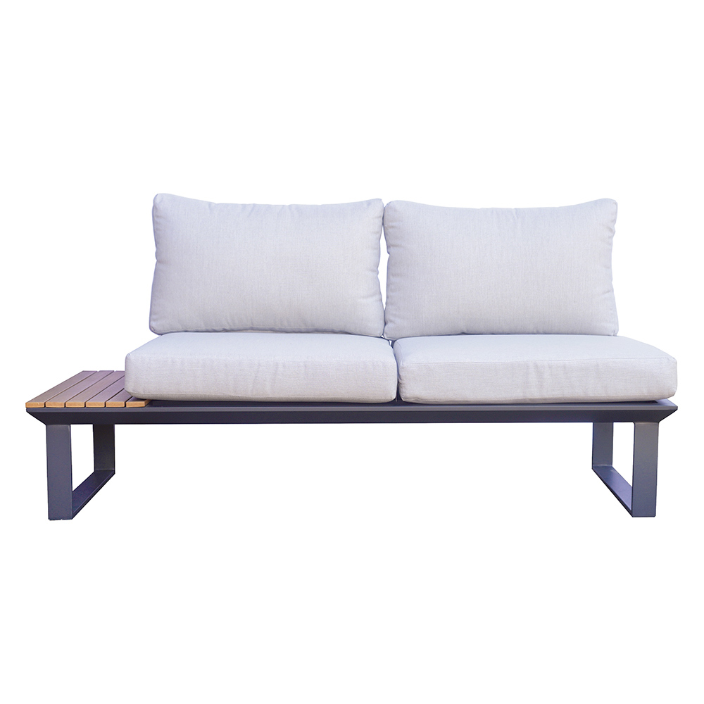 Venkovní obýváková souprava obsahující 2 2místné pohovky a rohovou pohovku z antracitového hliníku a s vyjímatelnými šedými polštáři . Dvoumístné pohovky jsou vybaveny odkládacími stolky a součástí je také centrální stůl , vše vyrobeno s antracitovou hliníkovou konstrukcí a deskou z pryskyřice.