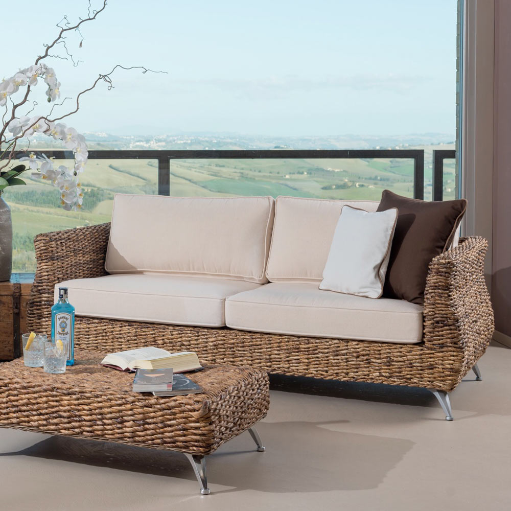 obývací pokoj patří do celé kolekce, která vyniká moderními tóny jak v designu sedáků, tak v detailu hliníkových nohou . Zároveň ji však oživuje hřejivost přírodního výpletu , ručně vyrobeného pomocí rafinovaného přírodního banánového výpletu.