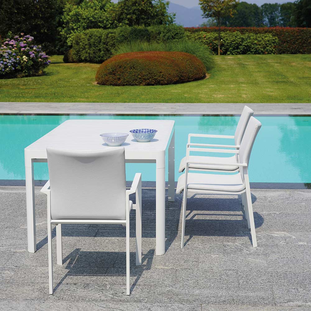 základními liniemi s letní příchutí, ideální pro dotvoření a obohacení jakéhokoli stylu nábytku, od klasické zahrady nebo domácí terasy až po nejexkluzivnější smluvní prostředí. Tento stůl je moderní a funkční, ideální pro formální i neformální příležitosti, kde si získá střed pozornosti díky svému