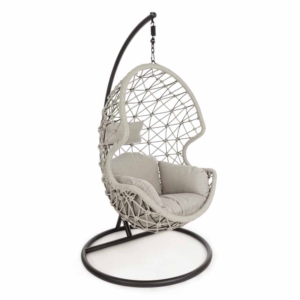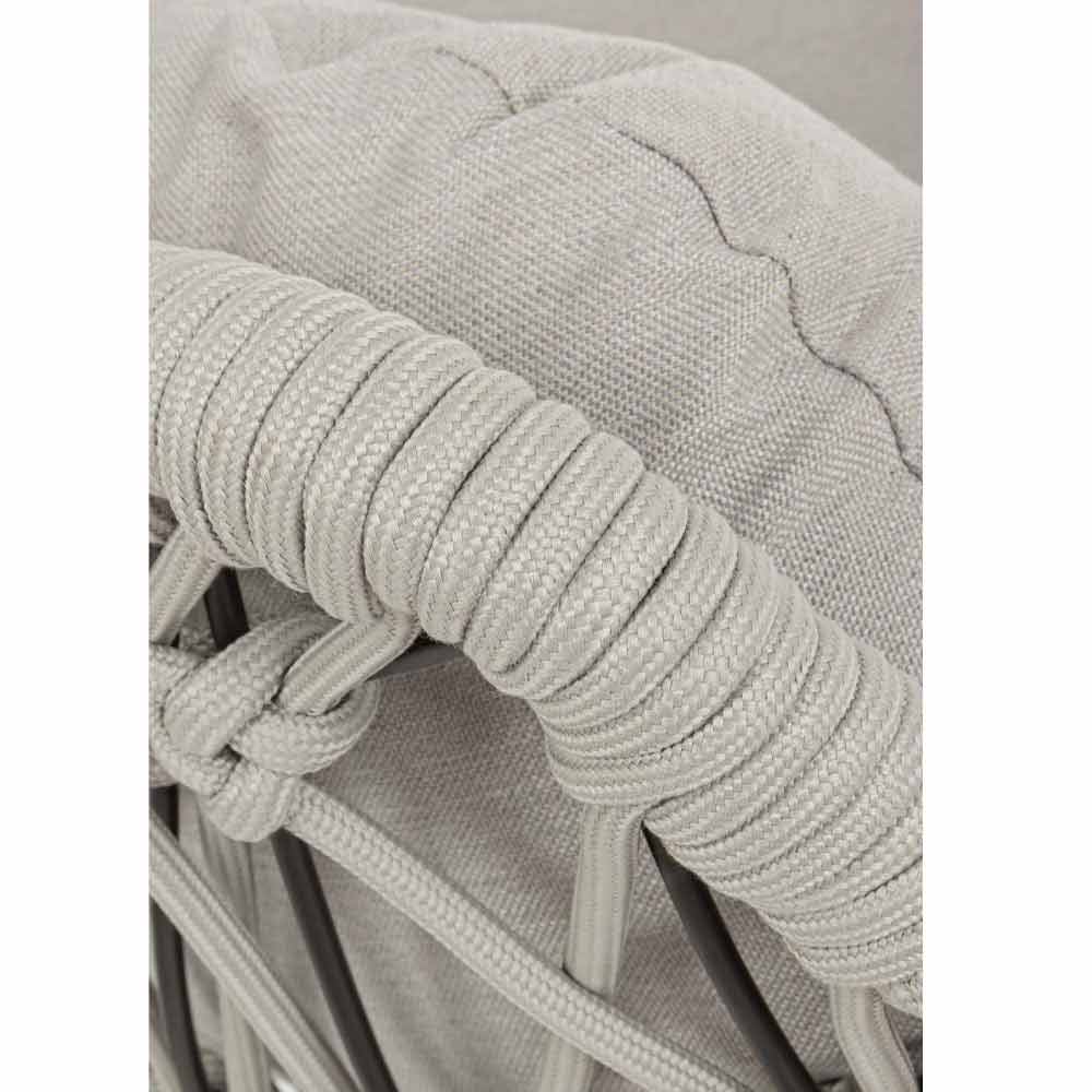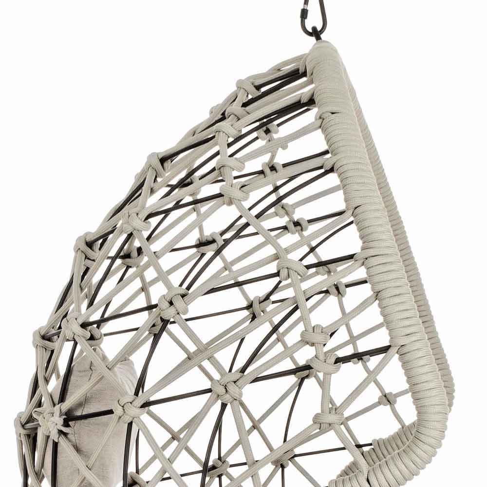 Zavěšené venkovní křeslo z oceli a lana s odnímatelnými polštáři.
