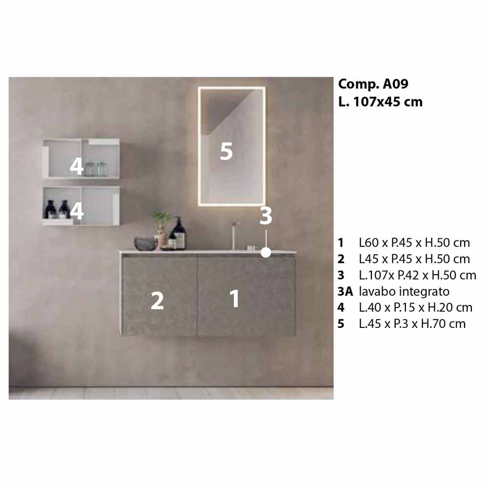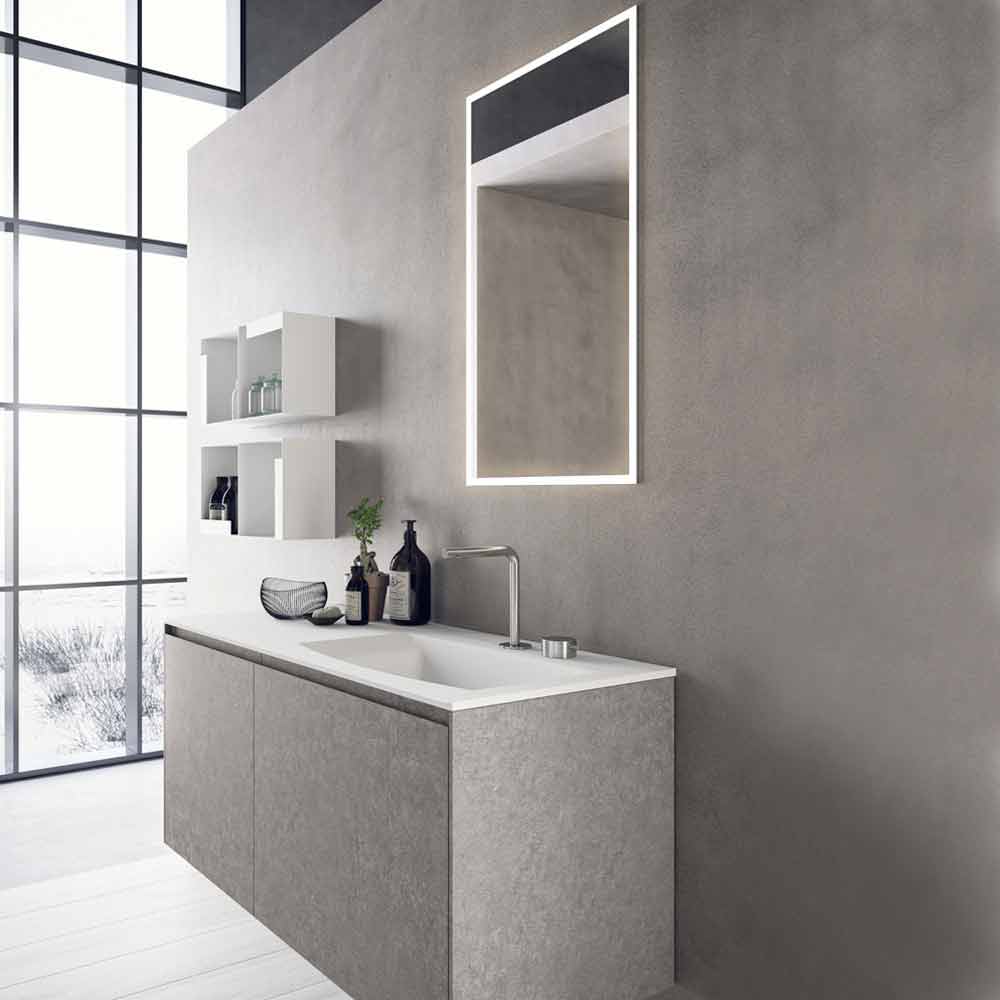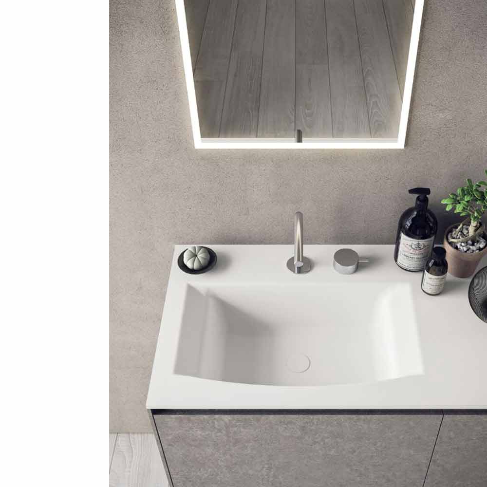 Tato formální jasnost je dána drážkovými dveřmi s nakloněným profilem a ultra-minimálním obdélníkovým zrcadlem s rámem s vlastním osvětlením.
