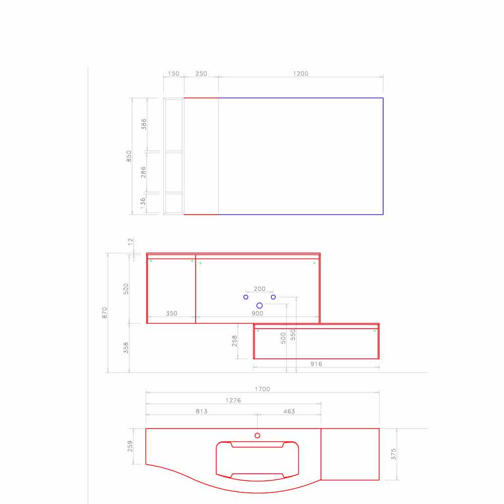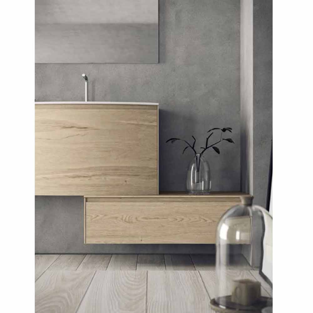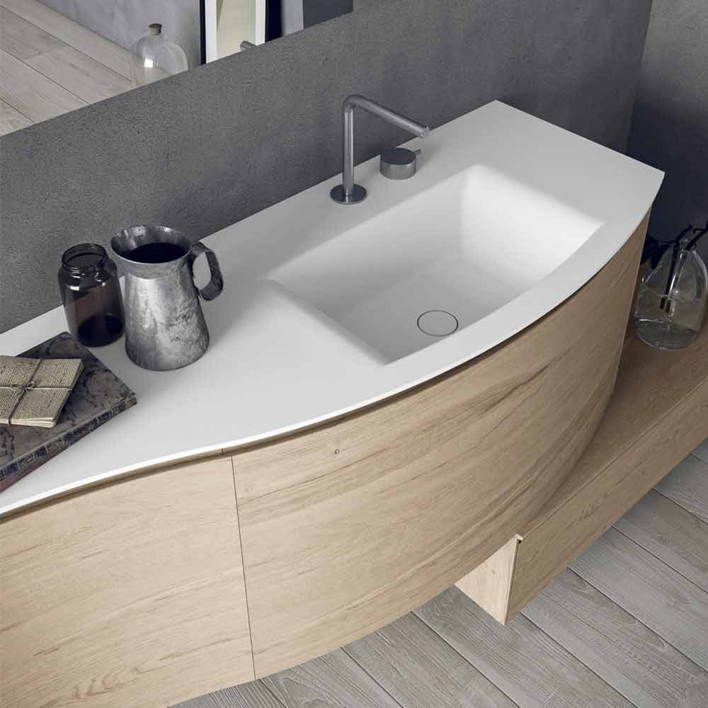 Zvláštnost této kompozice je dána zabudovaným umyvadlem charakterizovaným dvěma bočními stranami, které jemně sestupují směrem k pánvi, a spodní zakřivenou stěnovou jednotkou, která narušuje pravidelnost struktury pro příjemnější atmosféru.