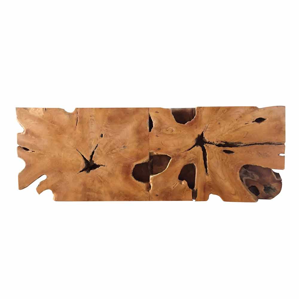 masivního teakového dřeva obnoveného a spojených dohromady. Obdélníkový tvar vrcholu však zachovává všechny vlastnosti použitého kmene nebo kořene evidentní. Uzly dřeva a rouby větví, nerovnosti kmene a odstíny barev vykreslují na každém vrcholu