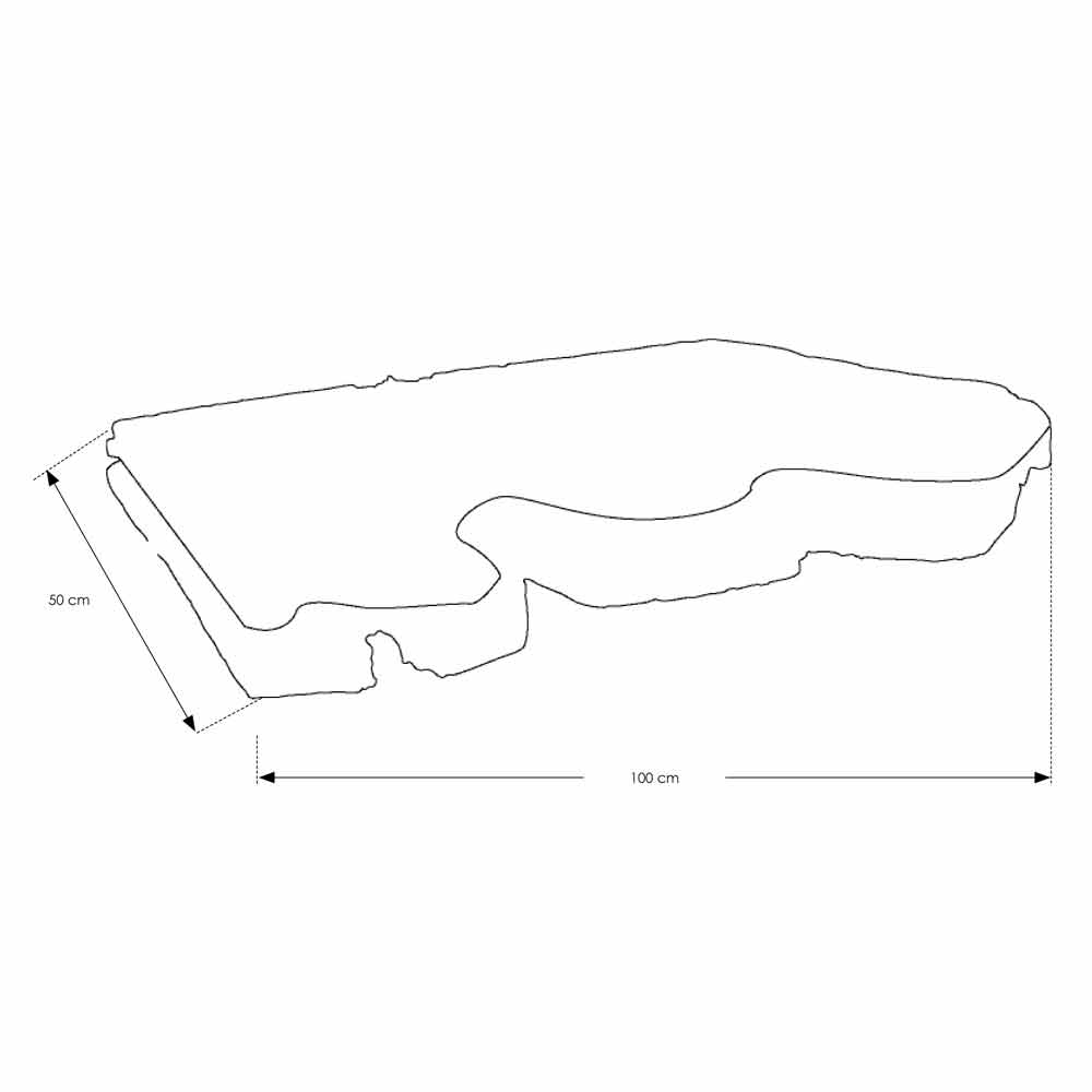 Masivní teaková deska variabilního tvaru a velikosti. Podpěrné police na vyžádání. Jelikož se jedná o jedinečný a neopakovatelný kus, uvedené míry jsou přibližné.