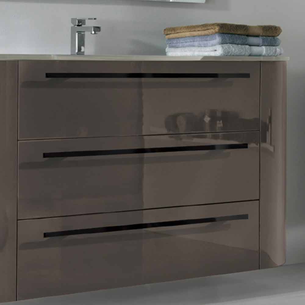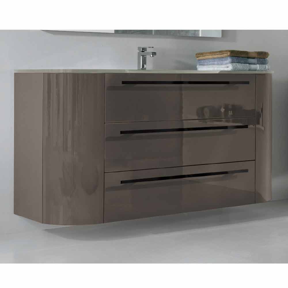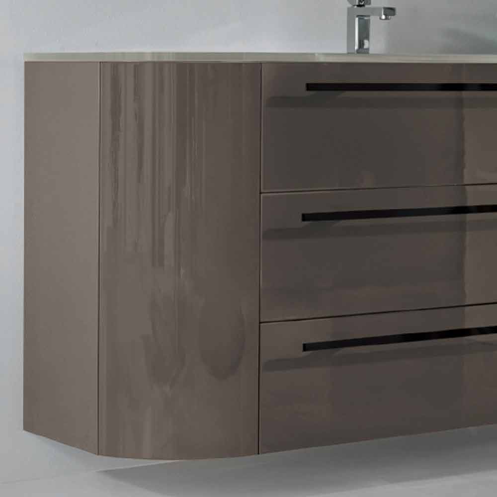 Držák na umyvadlo s moderním designem se skládá ze 3 odnímatelných zásuvek cm. 96 plus 2 zaoblené boční dveře cm. 24 caduna; chromové rukojeti. Lesklý lesklý dřevěný povrch v různých barvách. Skleněná deska s integrovaným umyvadlem.
