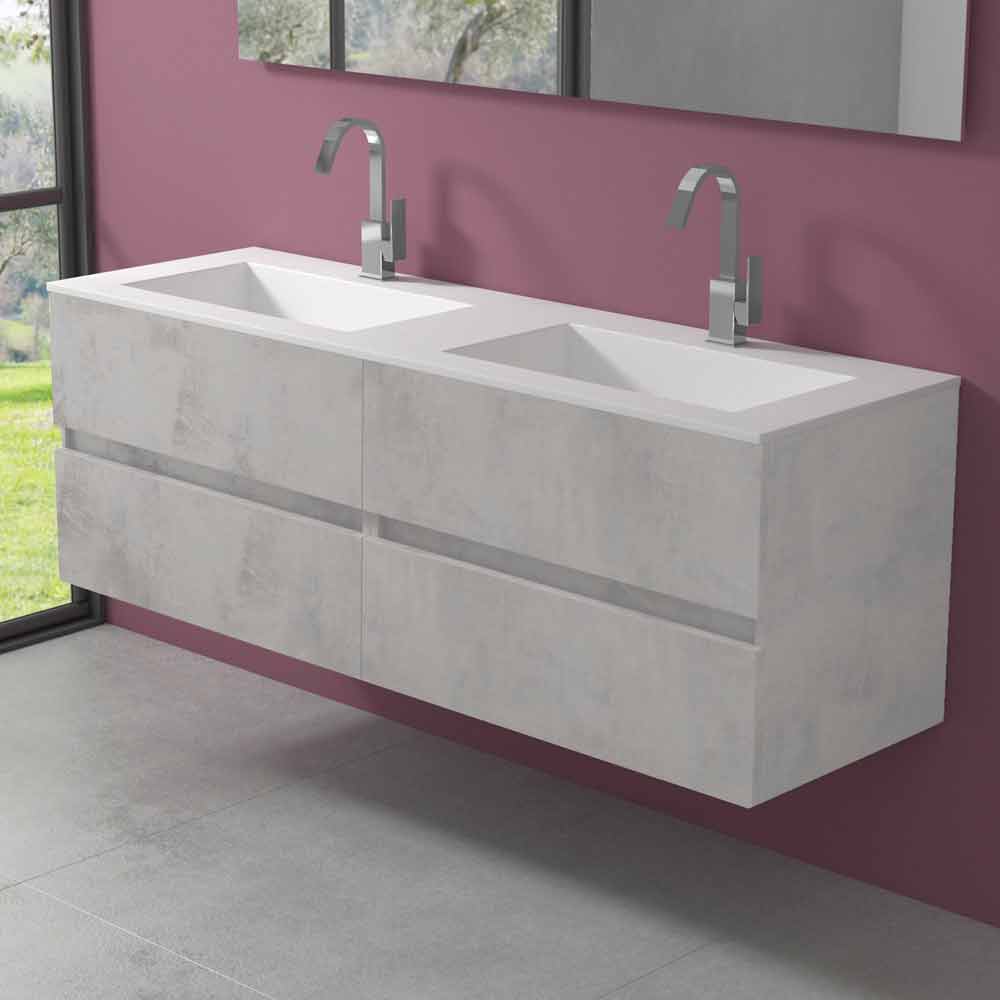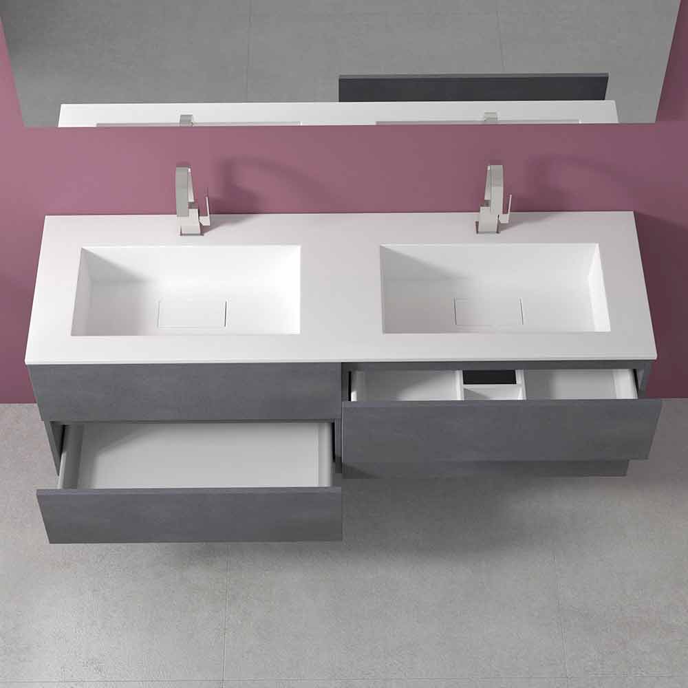 Tento zavěšený koupelnový nábytek s integrovaným dvojitým umyvadlem poskytuje příjemnou a mimořádně elegantní atmosféru.