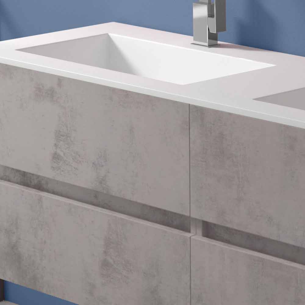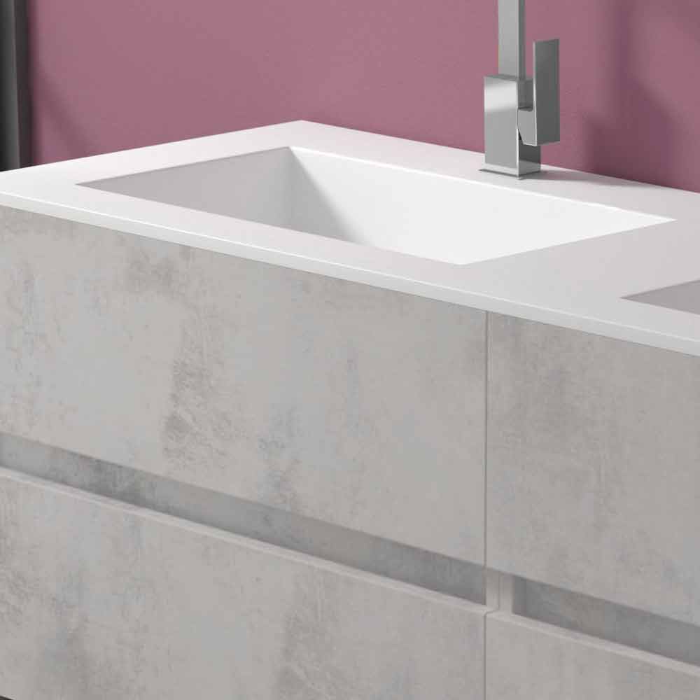 Dvojitý Integrovaný obdélníkové umyvadlo je vyrobena z pevného matné, bílé neprůhledné minerální pryskyřice, a skončil v neprůhledné gelcoatu, což činí produkt vodotěsný.