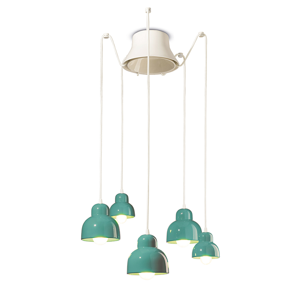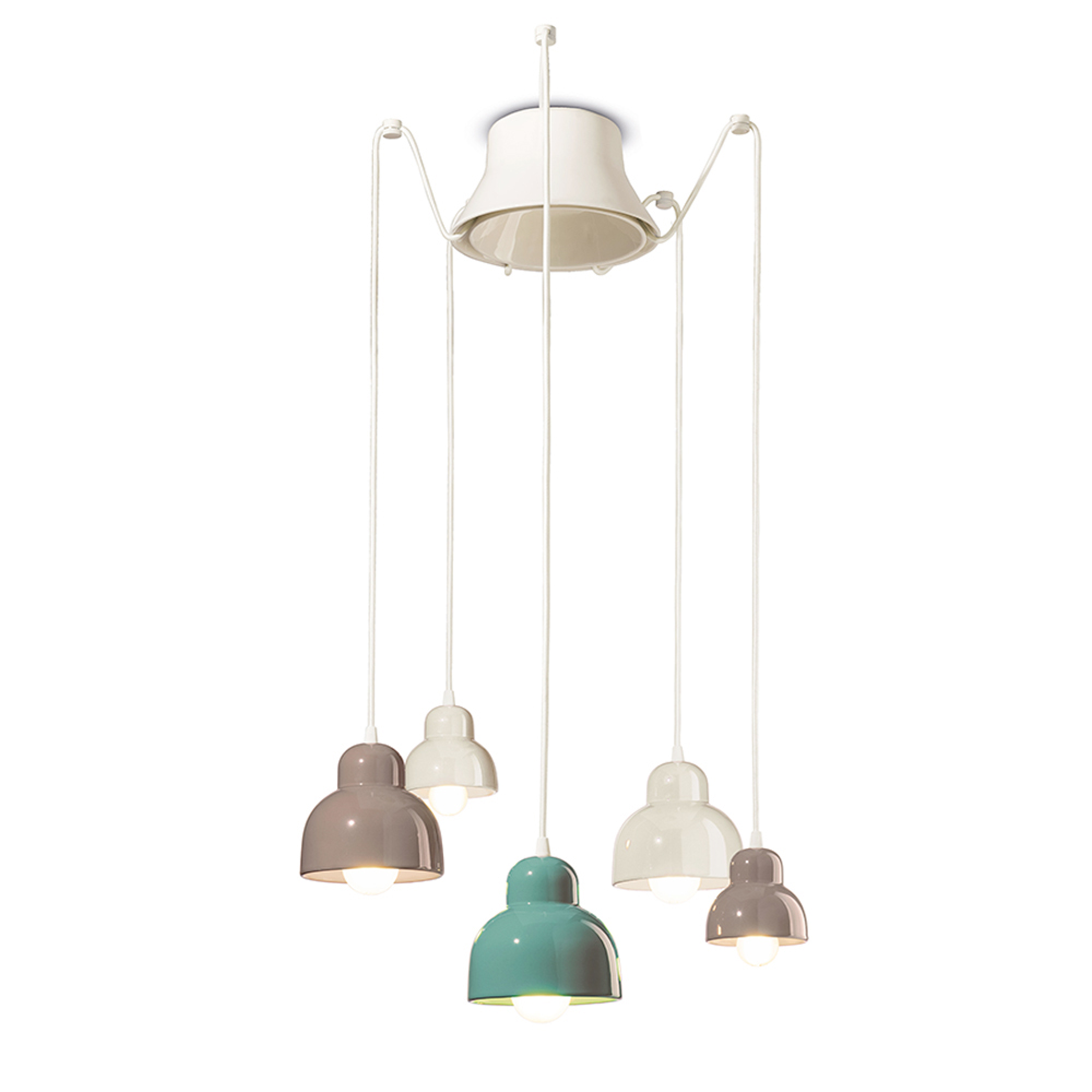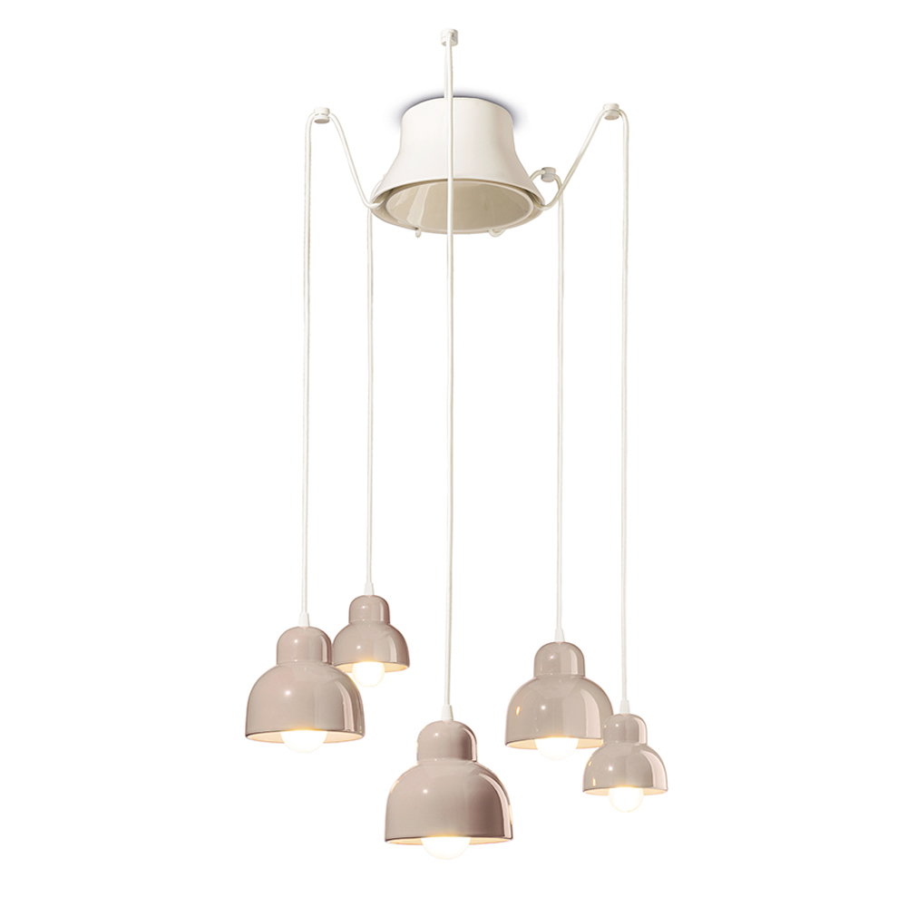 Tato keramická závěsná lampa je okouzlujícím příkladem současného designu inspirovaného tradicí . Jeho pět závěsných světel vyzařuje v různých výškách jako vizuální tanec tvarů a světel v prostoru.