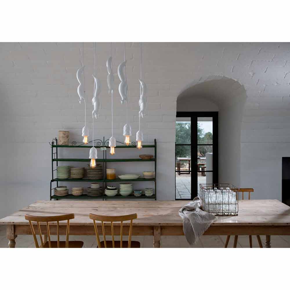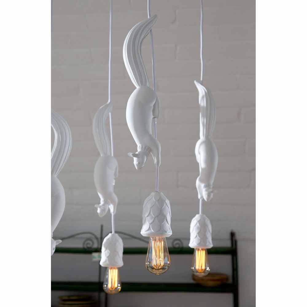 Tato originální a jedinečná závěsná lampa má originální a moderní design s vyobrazením žárovky, která se stává žaludem připraveným k tomu, aby ji zvedl zvíře, které sestupuje po drátu. Jedná se o vysoce působivý doplněk pro zábavnou a elegantní atmosféru, jako jsou plody světelného podrostu, který chce zdůraznit autentičnost a tisíc odstínů, které charakterizují osobnost každého, prostřednictvím reprezentace světelných prvků s jedinečným designem a inovativním .