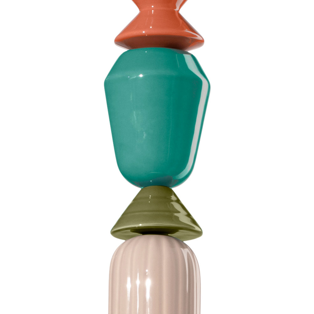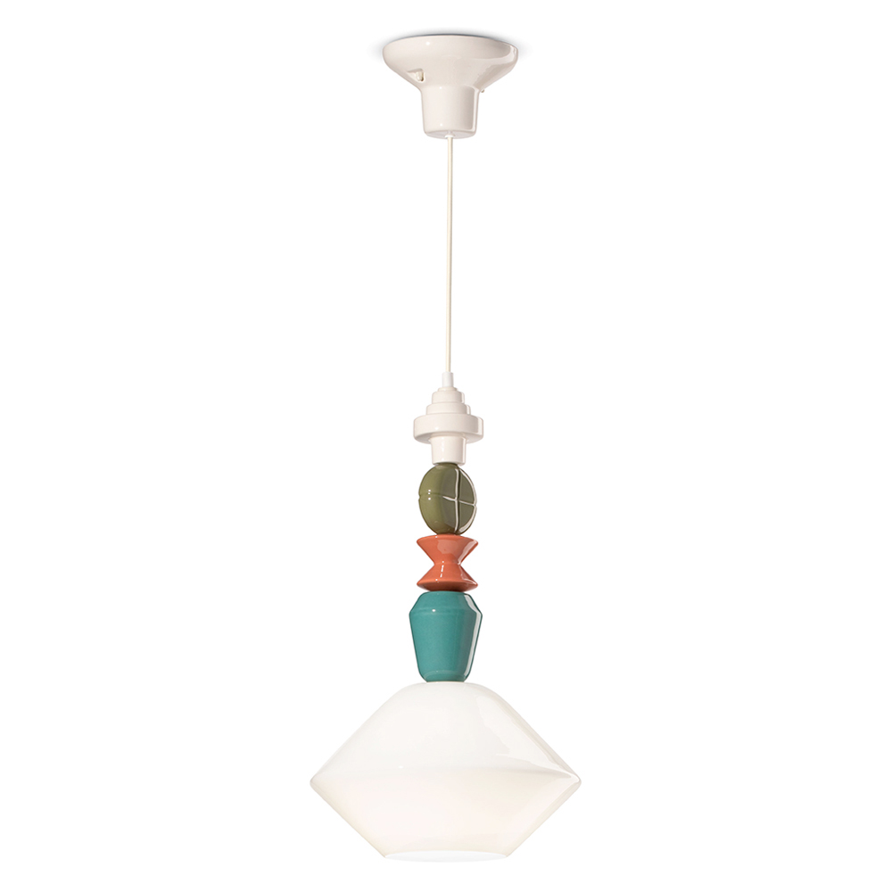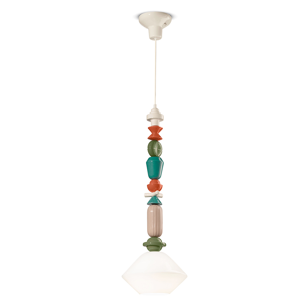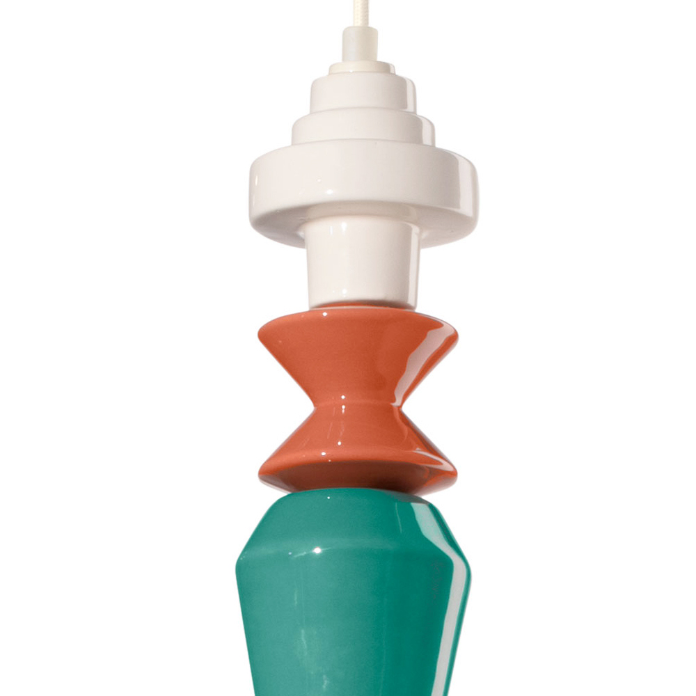Tato závěsná lampa je osvětlující umělecké dílo , které kombinuje teplo keramiky s průhledností skla. Se svými geometrickými tvary a sledem barevných prvků je tento nábytek jako totem světla a barev, který dodává osobitost a živost každé místnosti.
