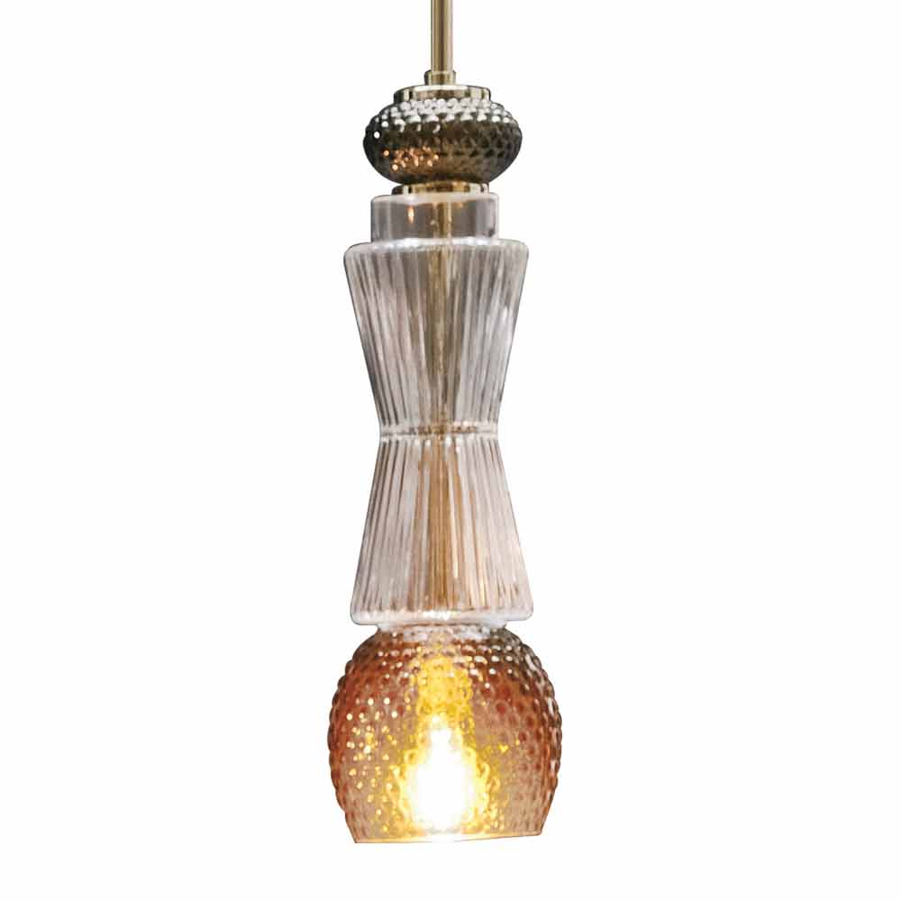 Závěsná lampa ze skla Murano se starožitným zdobením, detaily ve zlatě a kabel z antracitové tkaniny , vyrobené v Itálii. Setkání mezi nadčasovou elegancí skla Murano a vytříbeným nádechem zlatých prvků oživuje obzvláště inovativní řešení vybavení, protože je schopno spojit modernost a tradici s exkluzivním a avantgardním výsledkem, který úspěšně završí jak moderní, tak klasické prostory s osobností. Díky volbě hraní na geometrických tvarech a různých povrchových úpravách se zrodí myšlenka osvětlení s dynamickým efektem, které vytváří příjemnou a příjemnou atmosféru a zároveň obohacuje estetiku místnosti.