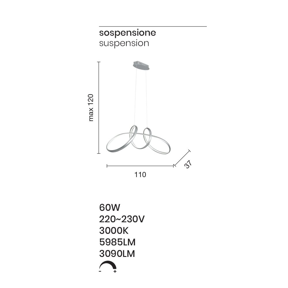 - L 110 x P 37 x V max 120 cm (LED 60W 220-230V 3000K 5985LM).
