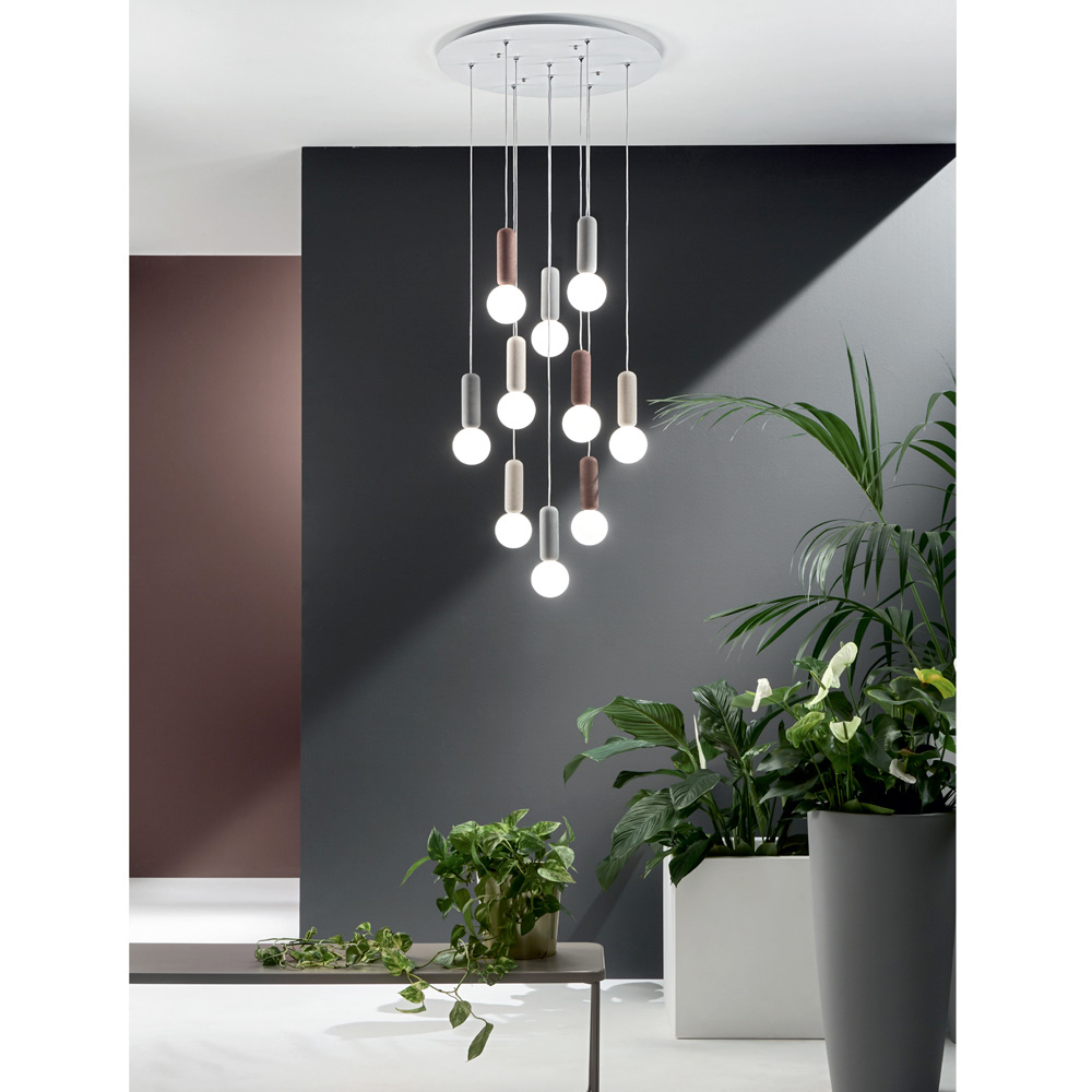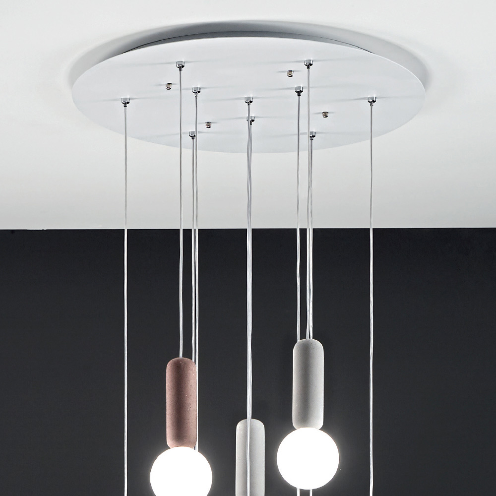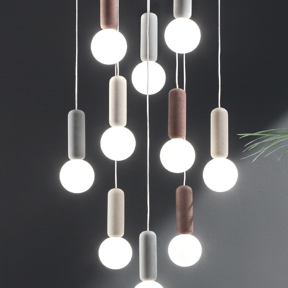 bílého saténového skla doplněné o délkově nastavitelné kabely. Neobvyklá a kreativní kombinace materiálů a povrchových úprav, která oživuje řešení zařízení, které je stejně výstřední, jako je elegantní a moderní. Nádherné barevné nuance zvolené pro betonové prvky se dokonale snoubí s jemným a romantickým povrchem skleněných stínidel a výsledkem je