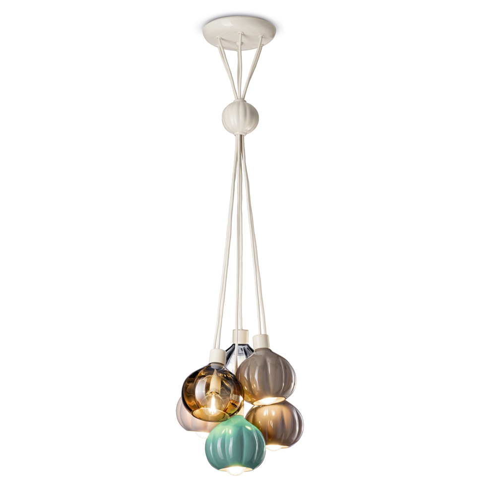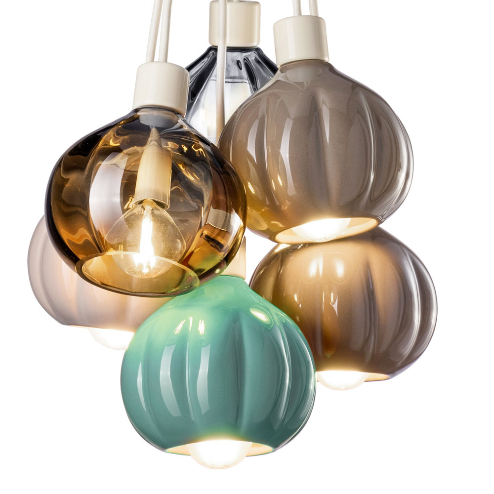 Hra výšek a rozmanitost barev vytváří harmonický celek, který se stává vizuálním opěrným bodem každé místnosti , zavěšenou sochou, která osvětluje a zároveň zdobí. Tato lampa je ideální volbou pro ty zákazníky, kteří hledají jedinečný kus nábytku, který vypráví příběh, předmět, který není jen svítidlem, ale výrazným designovým prvkem.