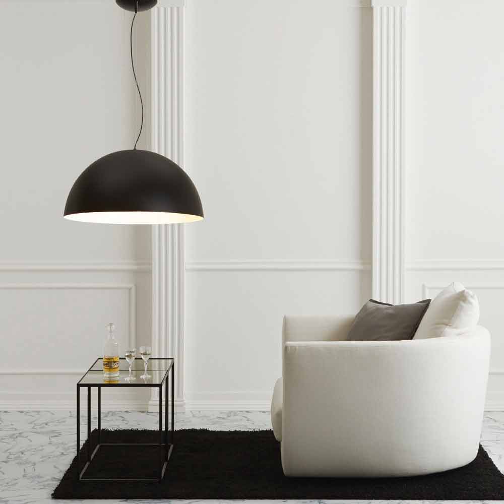 Lampa bicolor suspenze v práškové oceli potažené a zdobené ručně. Světlo se šíří rovnoměrně díky svému tvaru a bílé malované obložení.