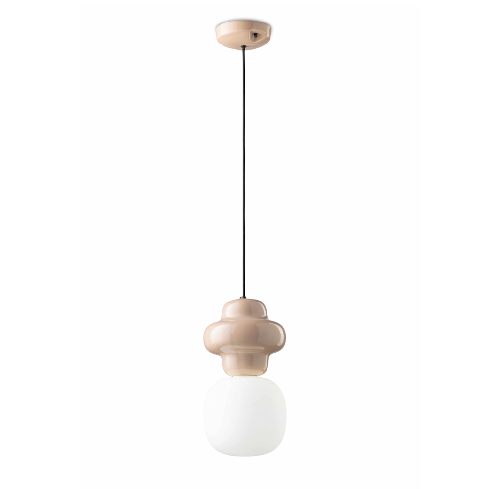 Toto elegantní závěsné svítidlo ztělesňuje harmonické spojení řemeslné zručnosti a moderního designu . Lampa je ideální pro ty, kteří ocení kvalitu Made in Italy, má lesklou keramickou základnu, která připomíná tradiční řemeslo a dodává nádech tepla. Jeho design je obohacen o difuzor ze saténového opálového skla, který produkuje měkké a přívětivé světlo, ideální pro vytvoření pohodlné a relaxační atmosféry v jakémkoli prostředí.