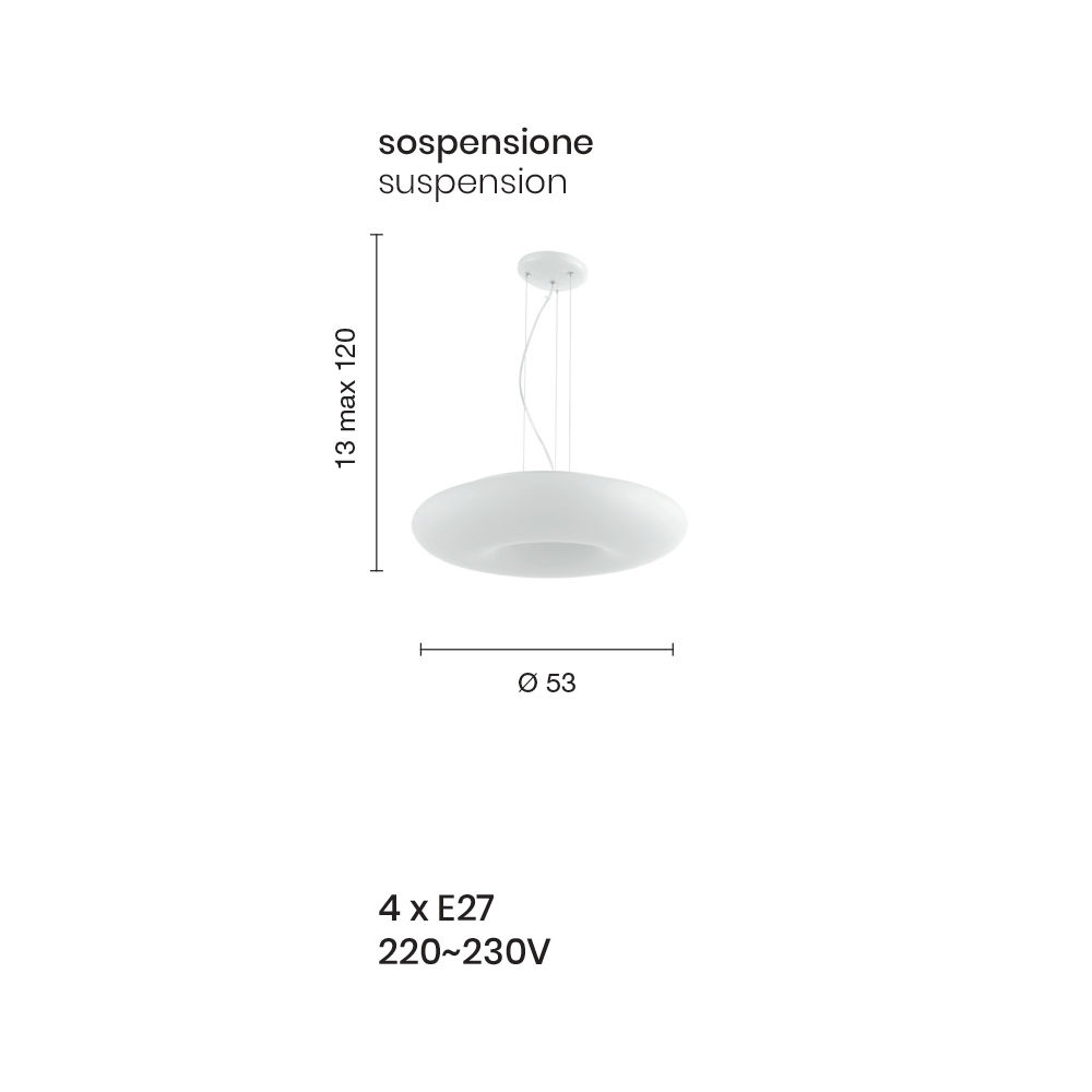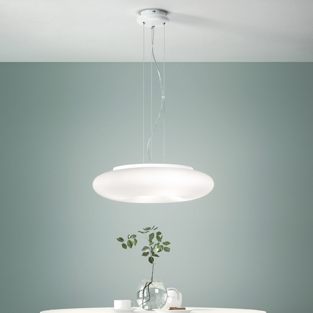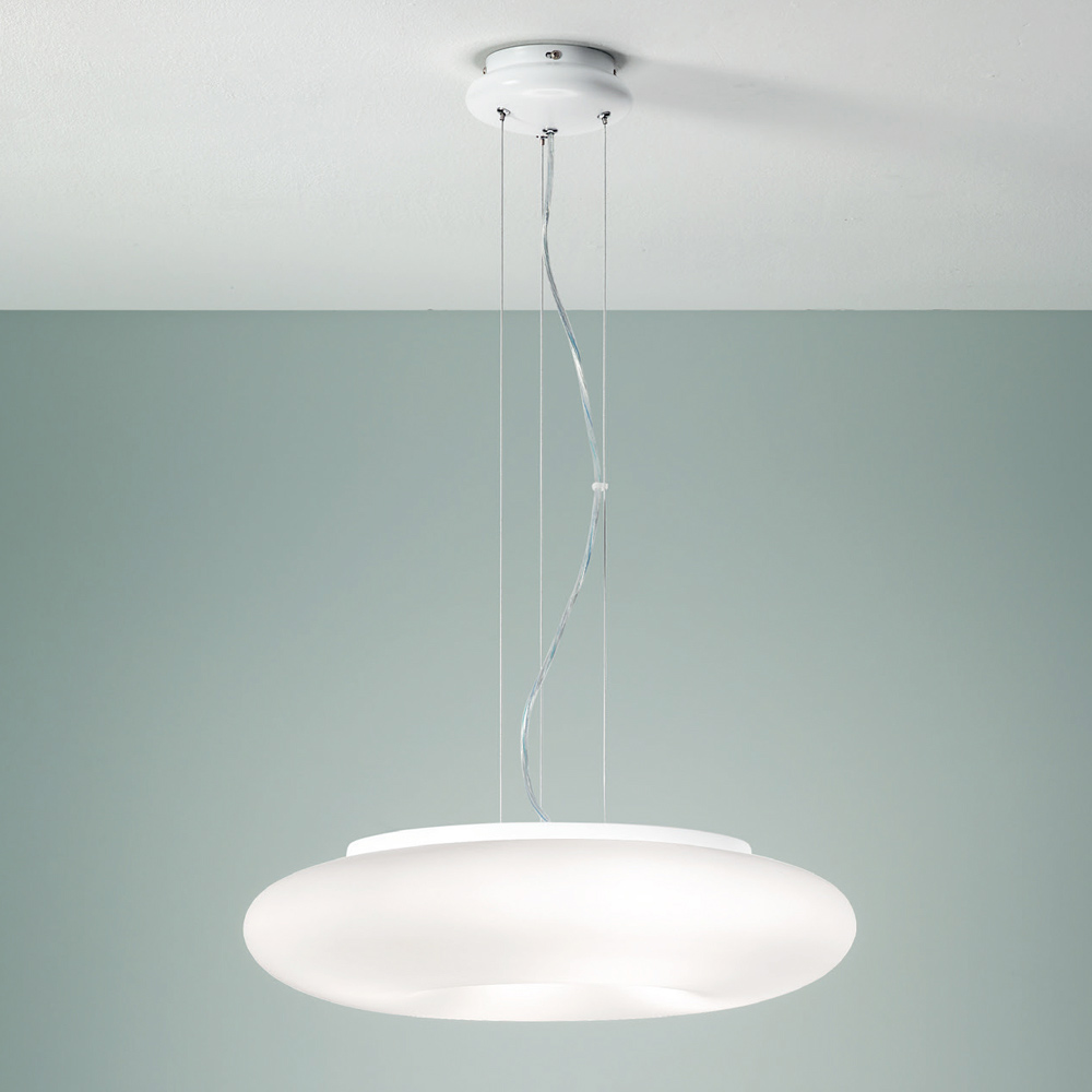 Závěsné svítidlo s konstrukcí z chromovaného kovu a difuzorem z bílého foukaného leptaného skla s délkově nastavitelnými kabely. Jemné tvary a klikaté linie dávají život kvalitnímu řešení zařízení, které je schopné obohatit domácí prostory, jako jsou jídelny, obývací pokoje nebo ložnice, prostřednictvím silné moderní osobnosti a střídmého a elegantního charakteru . Jeho vytříbená estetika je podtržena a ojedinělá volbou použití foukaného skla, sofistikovaného materiálu, který zvyšuje exkluzivní stránku produktu a umožňuje obzvláště funkční osvětlení .