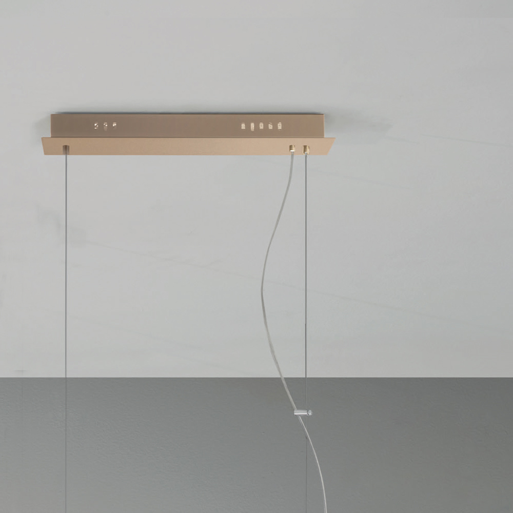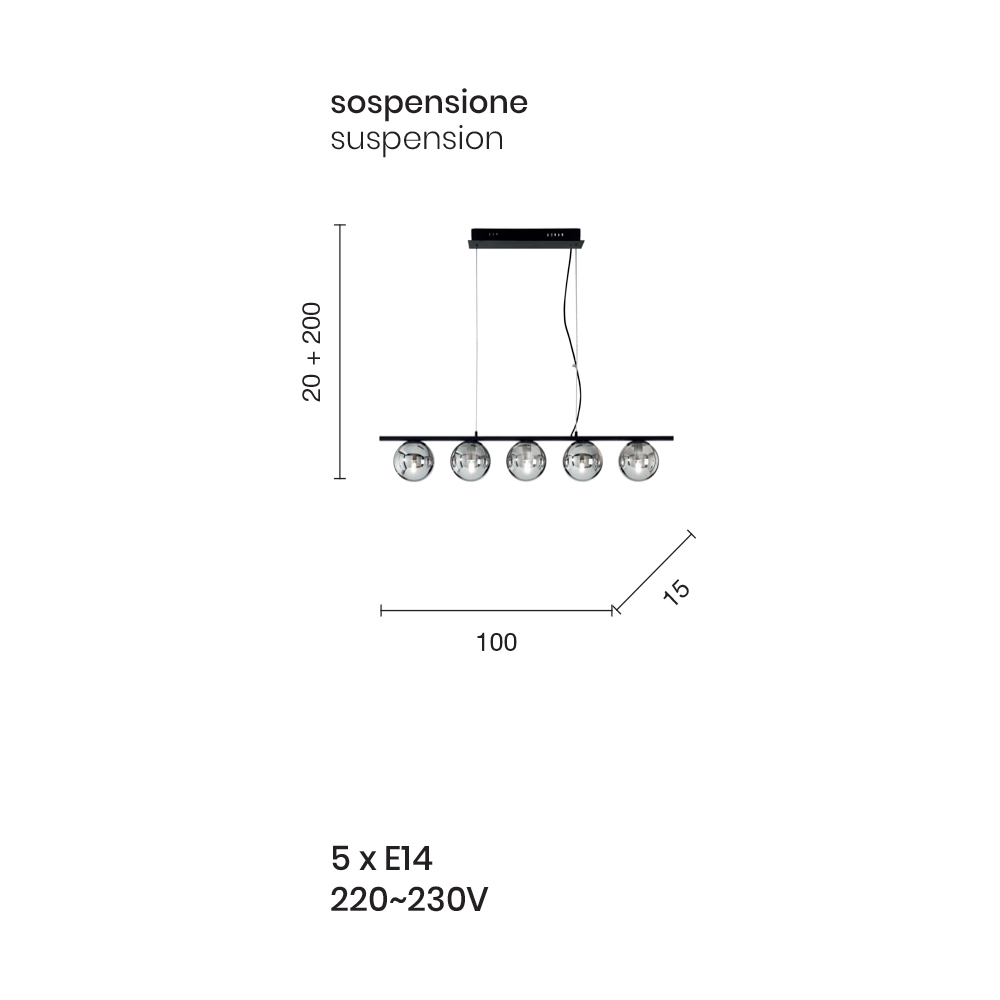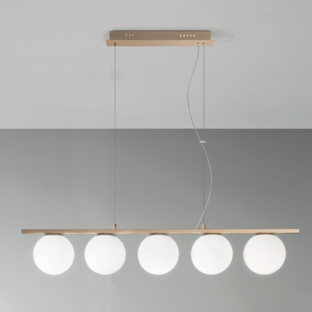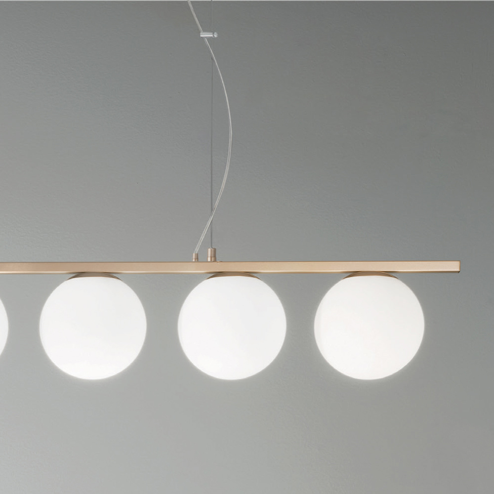 Závěsné svítidlo se zlatou kovovou konstrukcí a kulovými difuzory z foukaného skla doplněné o výškově nastavitelné kabely. Z dokonalého spojení moderního nádechu kovu a nadčasové elegance foukaného skla se rodí originální a rafinované řešení nábytku , schopné dobýt střed pozornosti v současném domácím prostředí. Jeho struktura se vyvíjí na jediné lince, díky čemuž je zvláště vhodným řešením pro osvětlení vašeho stolu v jídelně nebo kuchyni.