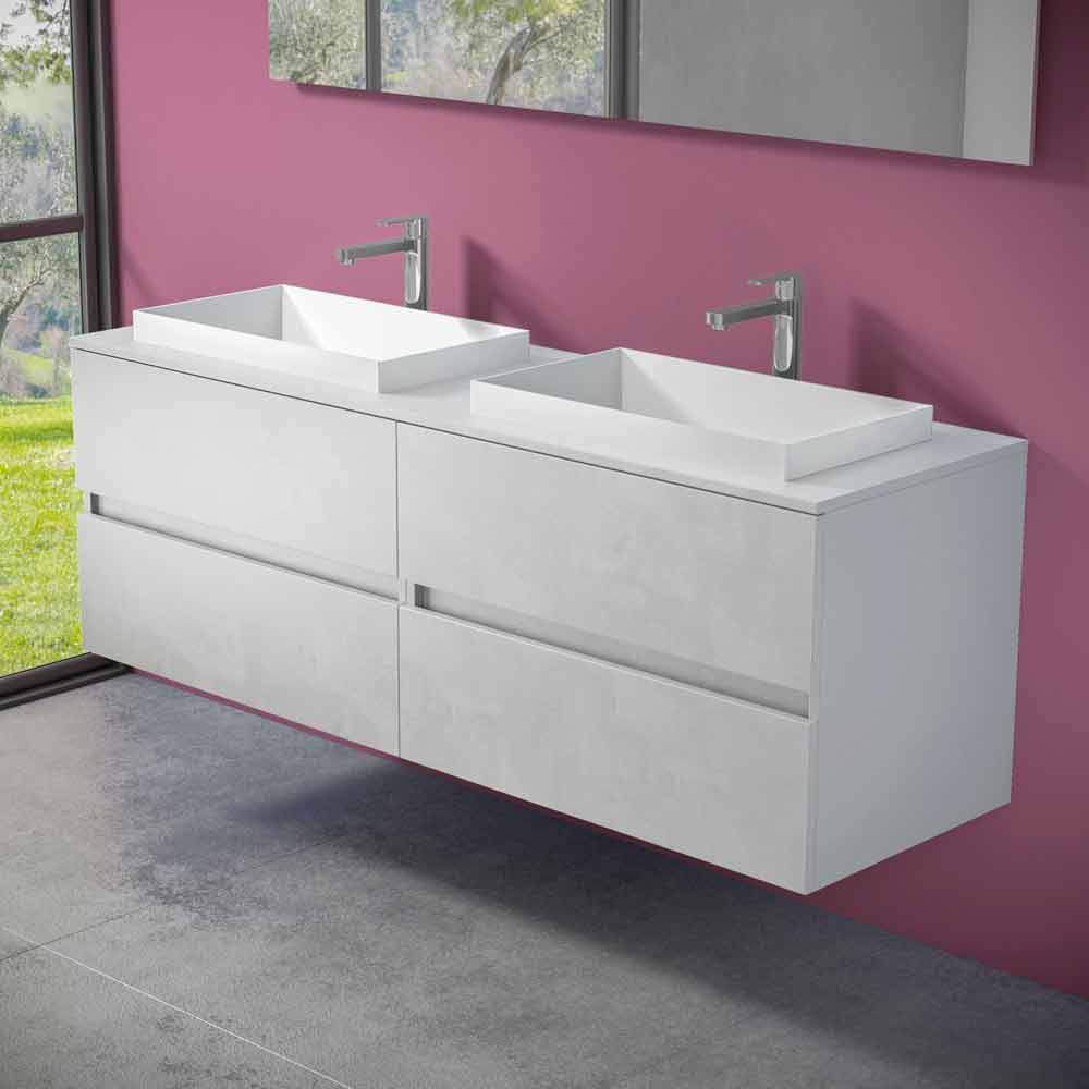 Jedná se o závěsný koupelnový nábytek s dvojitým vestavěným umyvadlem, který se vyznačuje moderním a nadčasovým designem , přičemž zvláštní pozornost je věnována jak estetice, detailům, tak praktičnosti a funkčnosti.