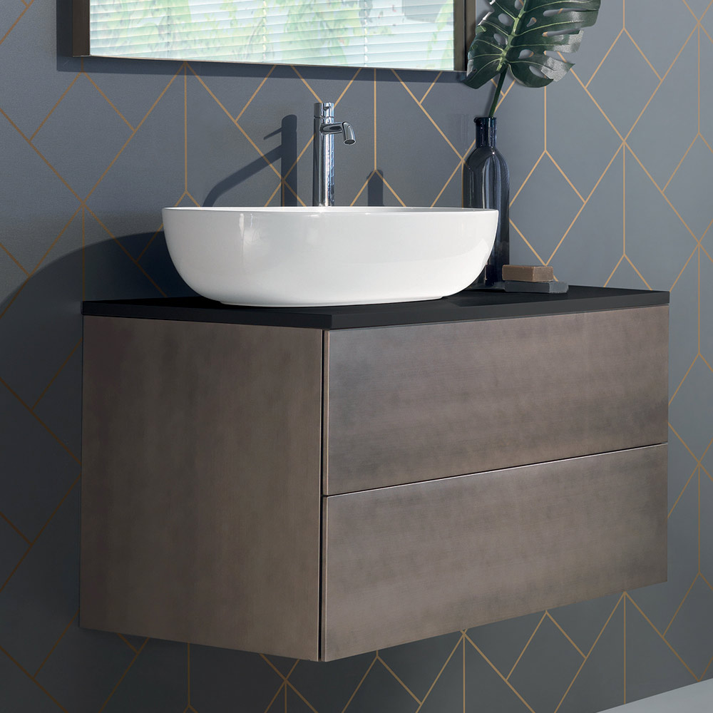 umyvadlový podstavec se 2 zásuvkami ze dřeva MDF se vzácnou matnou starožitnou platinovou lakovanou povrchovou úpravou a matně černý lakovaný dřevěný povrch s bílým keramickým umyvadlem.