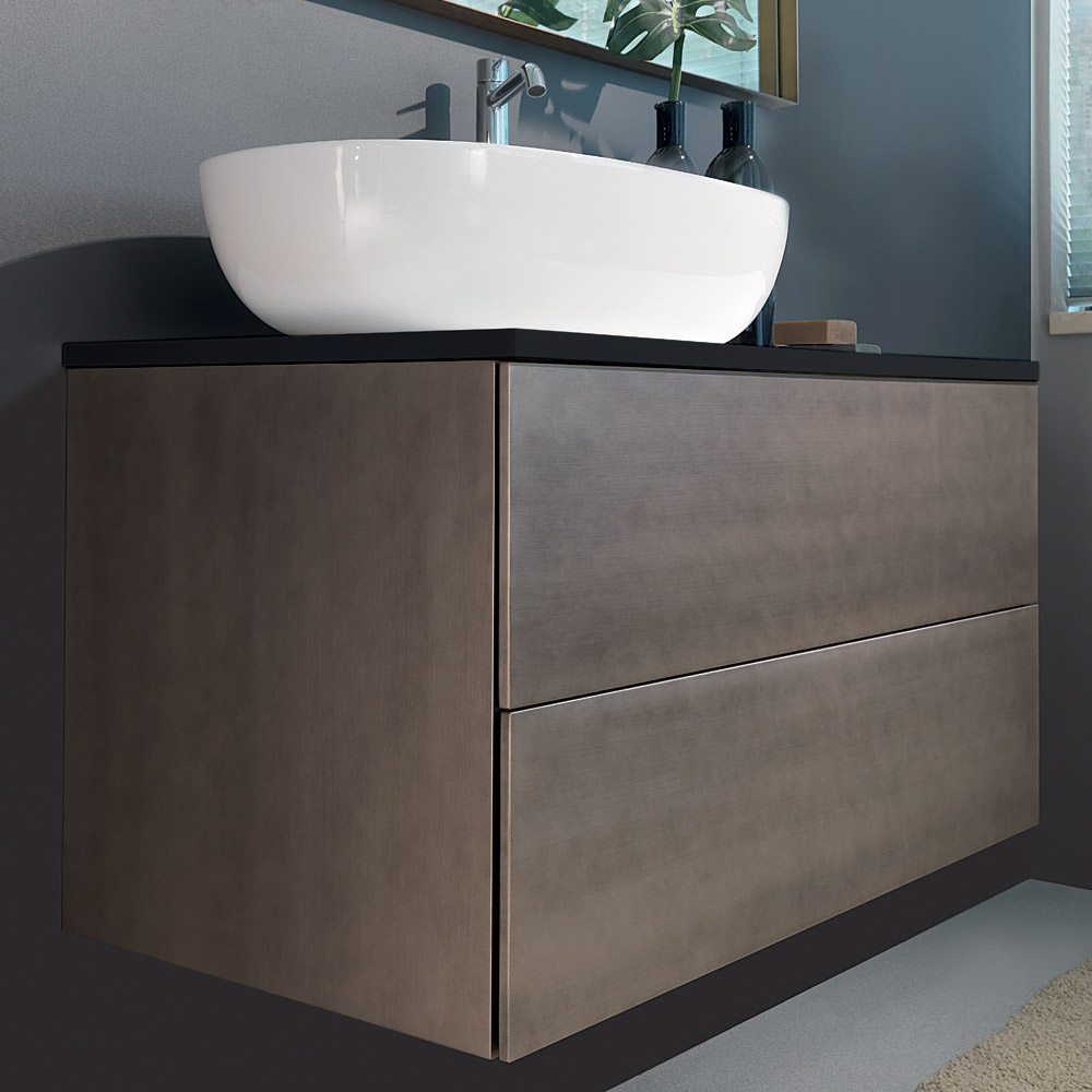 kompozice koupelnového nábytku se vyznačuje čistotou linií a vysoce rafinovaným povrchem.