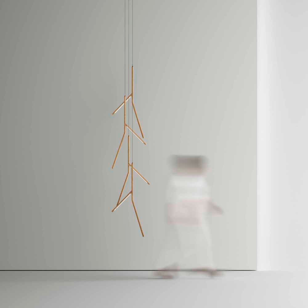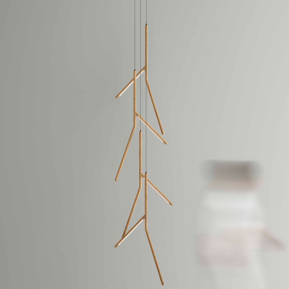 Tento lustr spojuje řemeslnou zručnost masivního dřeva se světelnou technikou. Jemný grafický znak je zdůrazněn v instalacích s více lampami a stává se absolutním protagonistou prostředí.