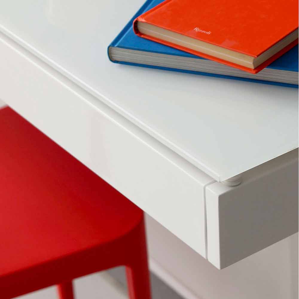 Závěsný psací stůl s montáží na stěnu vyrobený v Itálii se skleněnou deskou v lesklém bílém provedení s otvorem pro kabel, konstrukcí z matně bílého lakovaného kovu a odnímatelným vertikálním panelem z bílého plexiskla . Je také kompletní s LED osvětlením umístěným na horní straně a praktickou výsuvnou zásuvkou.