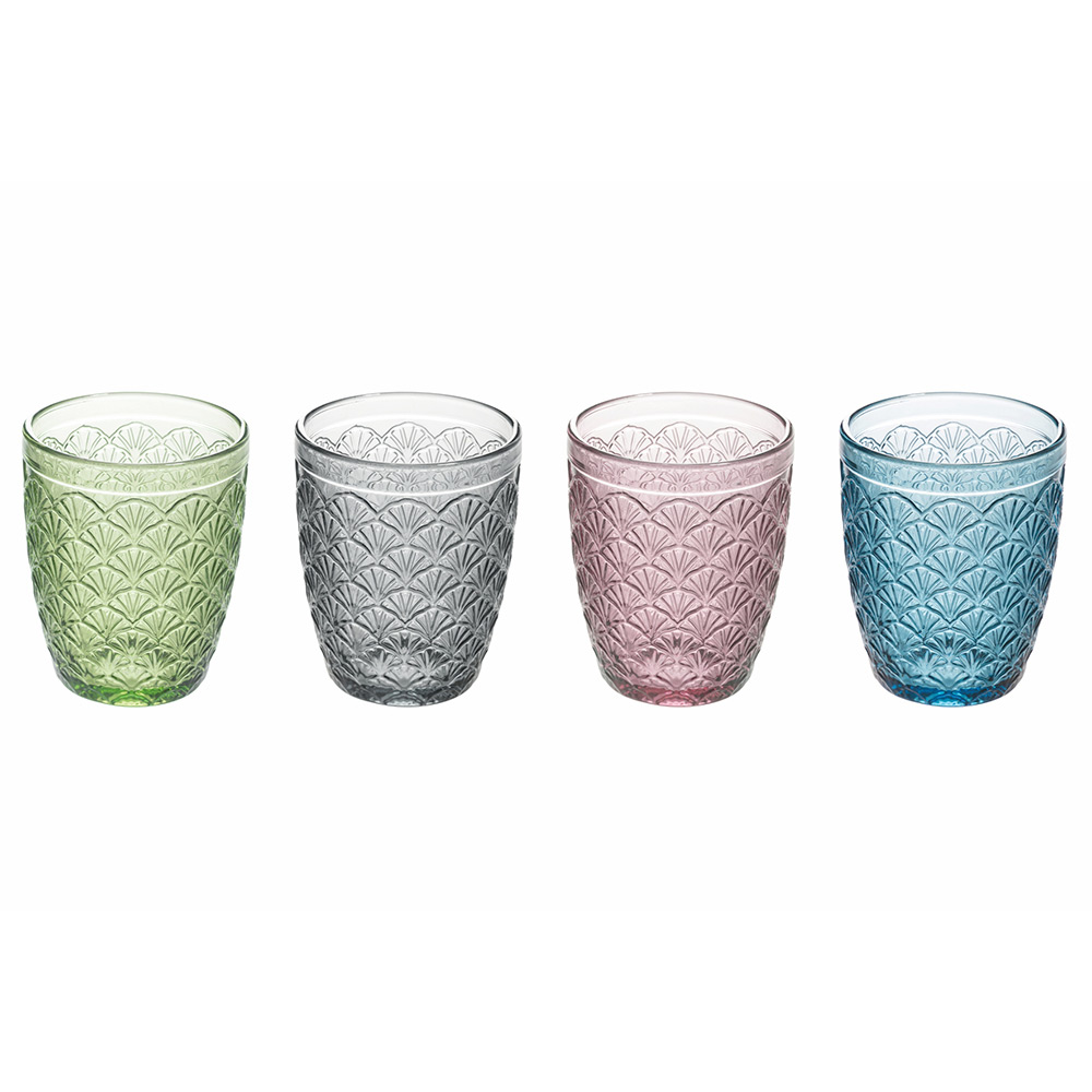 Sada sklenic na vodu v barevném skle a listové dekoraci, 12 kusů.