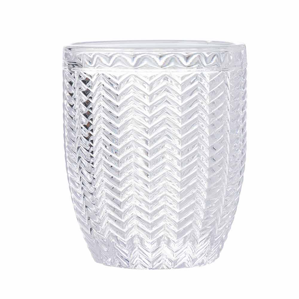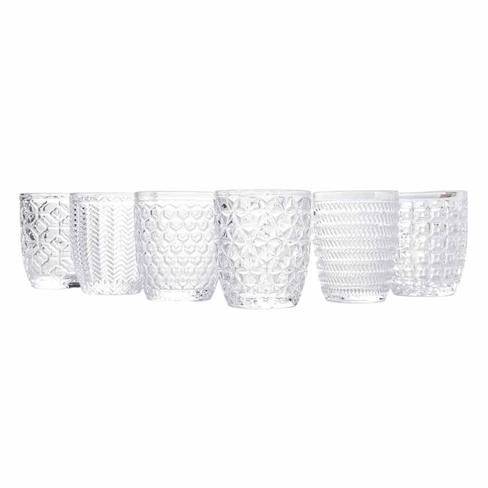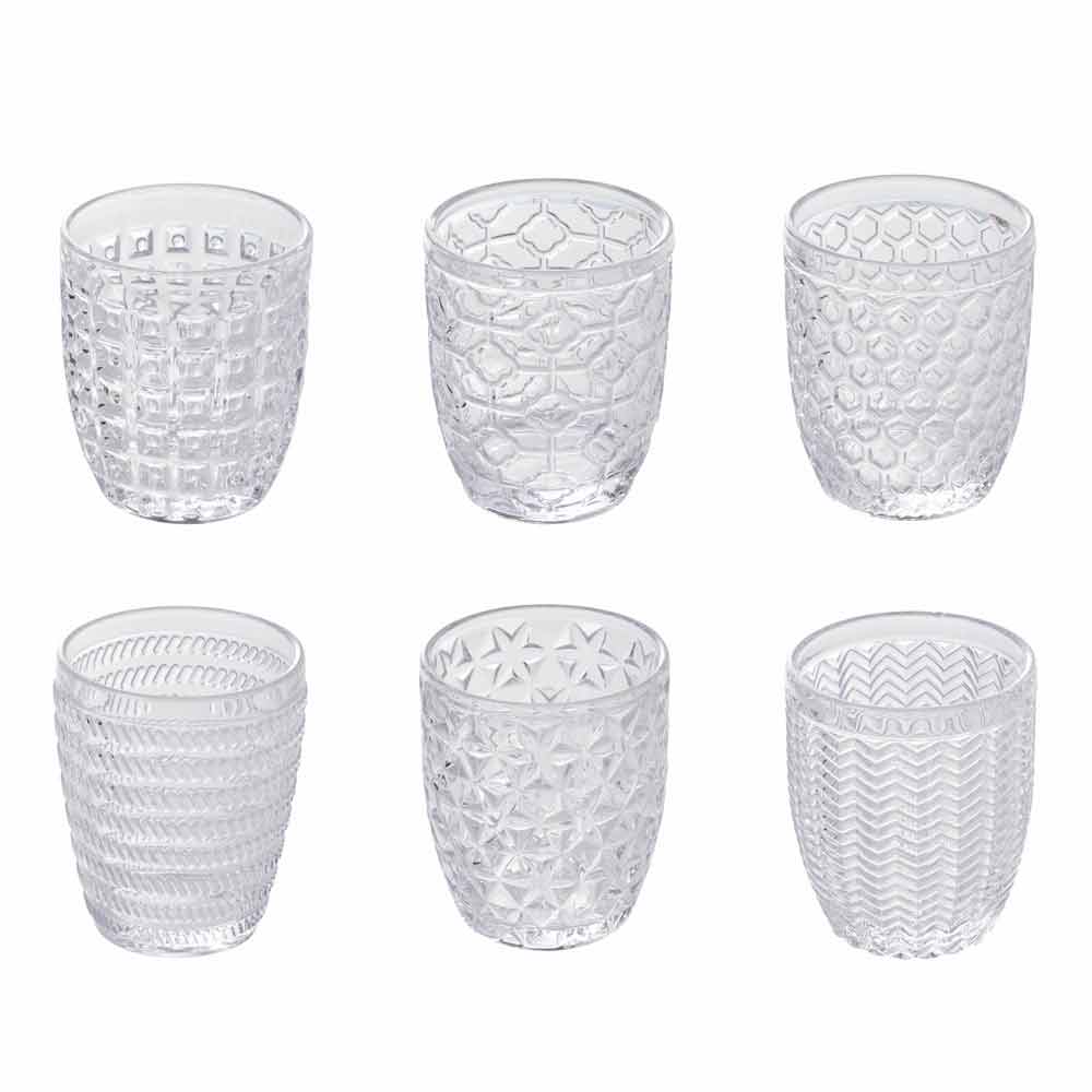 Sada sklenic na vodu z průhledného skla zdobená různými geometriemi, 12 kusů.