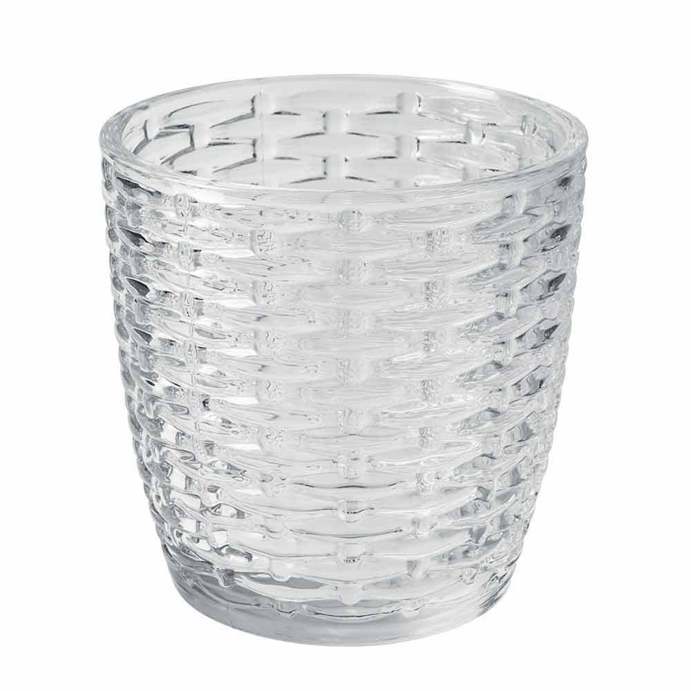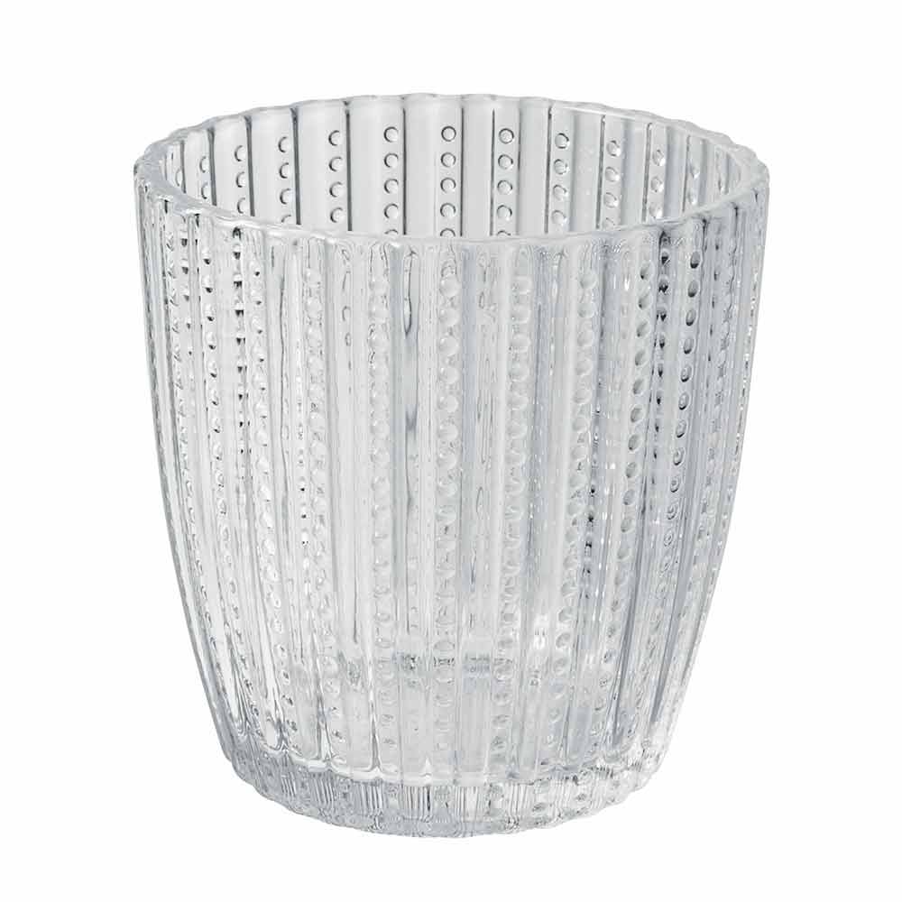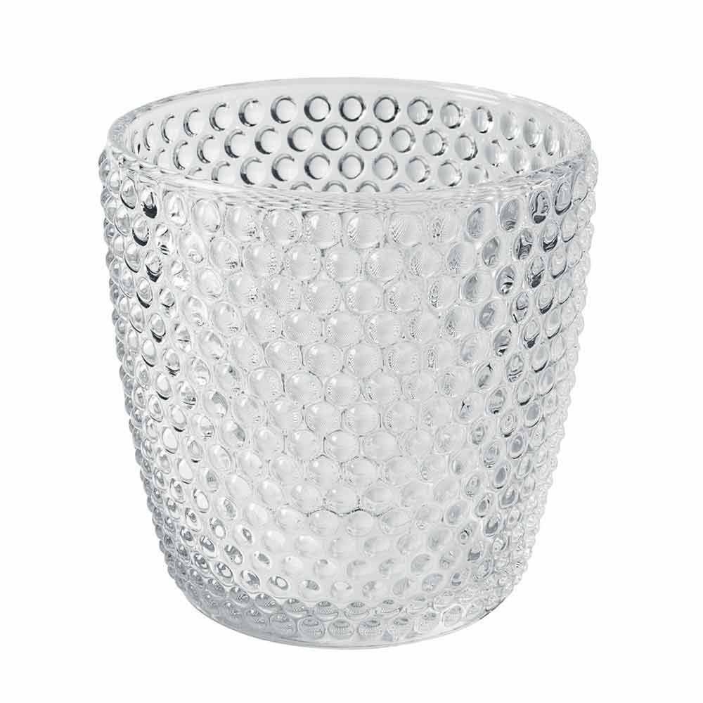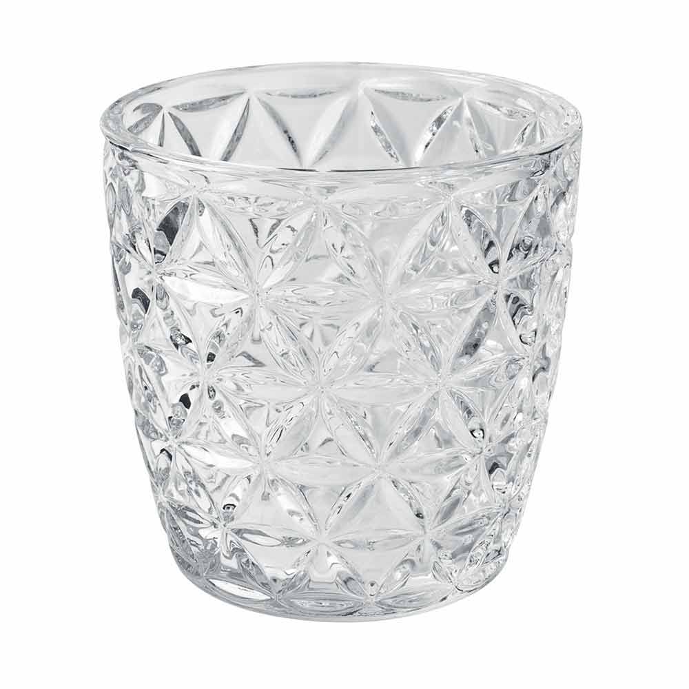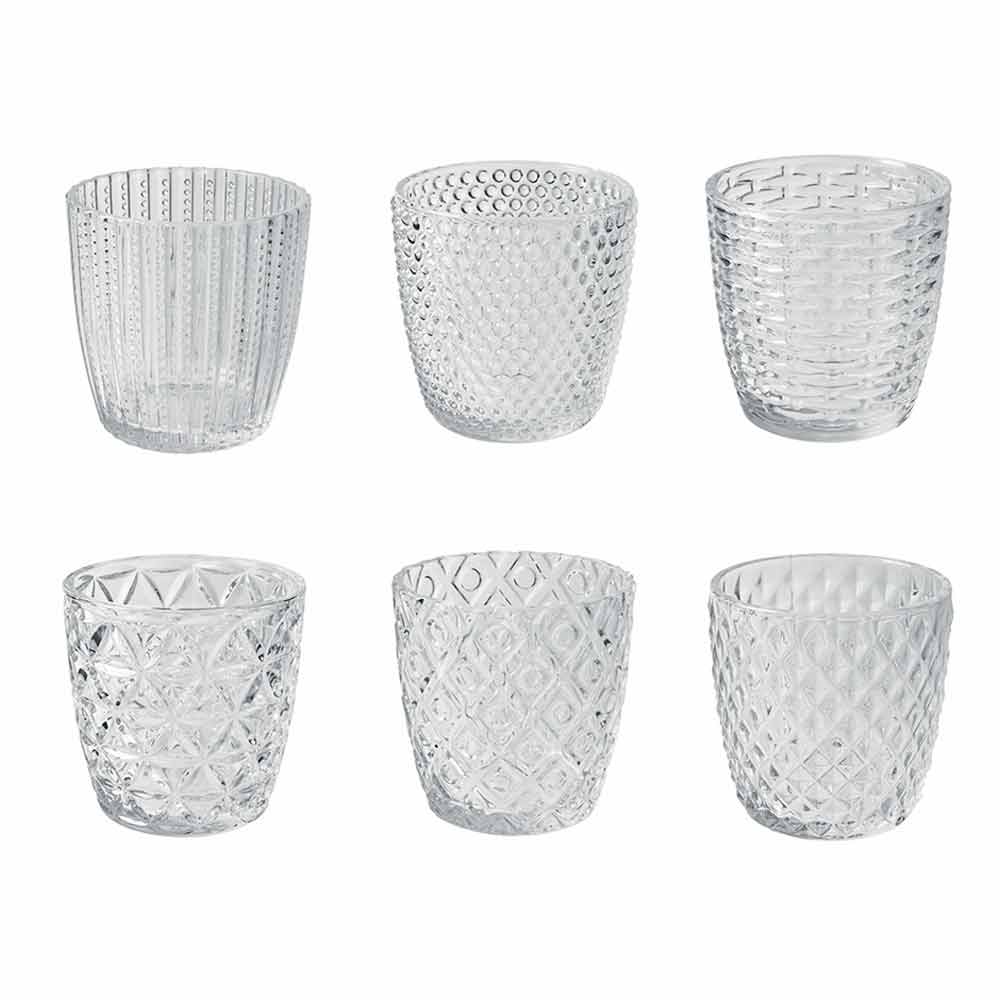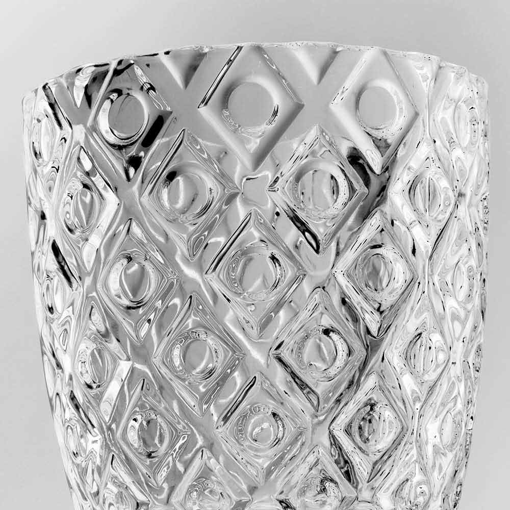 Sklenice na vodu z průhledného skla a povrch zpracovaný různými geometrickými dekoracemi, 12 kusů.