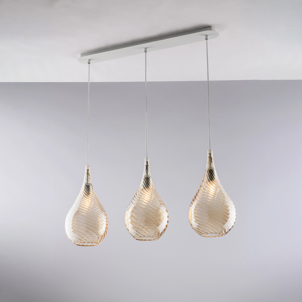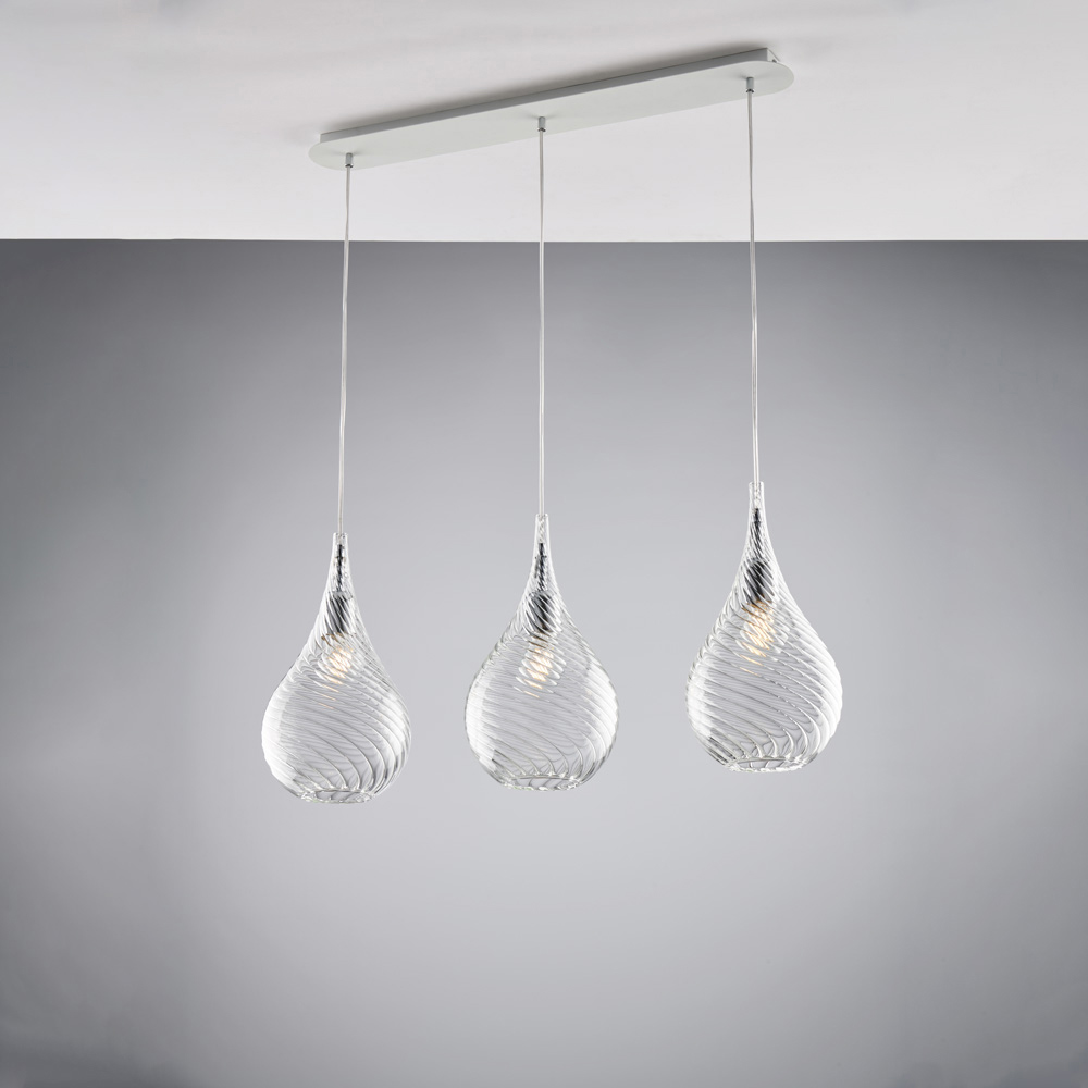 Toto elegantní a funkční ručně vyrobené závěsné svítidlo z litinové kolejnice s pyrexovým sklem je moderním řešením osvětlení, které je navrženo tak, aby prostor vylepšilo vyvážením a lehkostí. Tři křivky a rafinované difuzory z pyrexového skla jsou zavěšeny na lineární kolejnici, která zajišťuje rovnoměrné rozložení světla a silný estetický dojem.