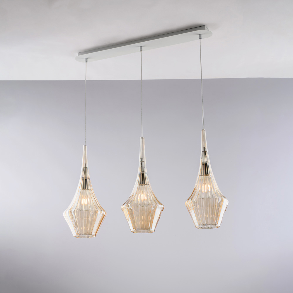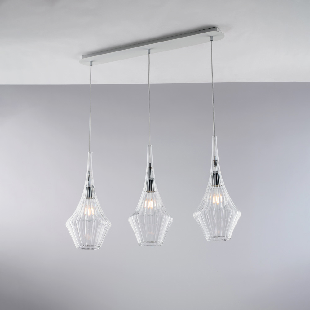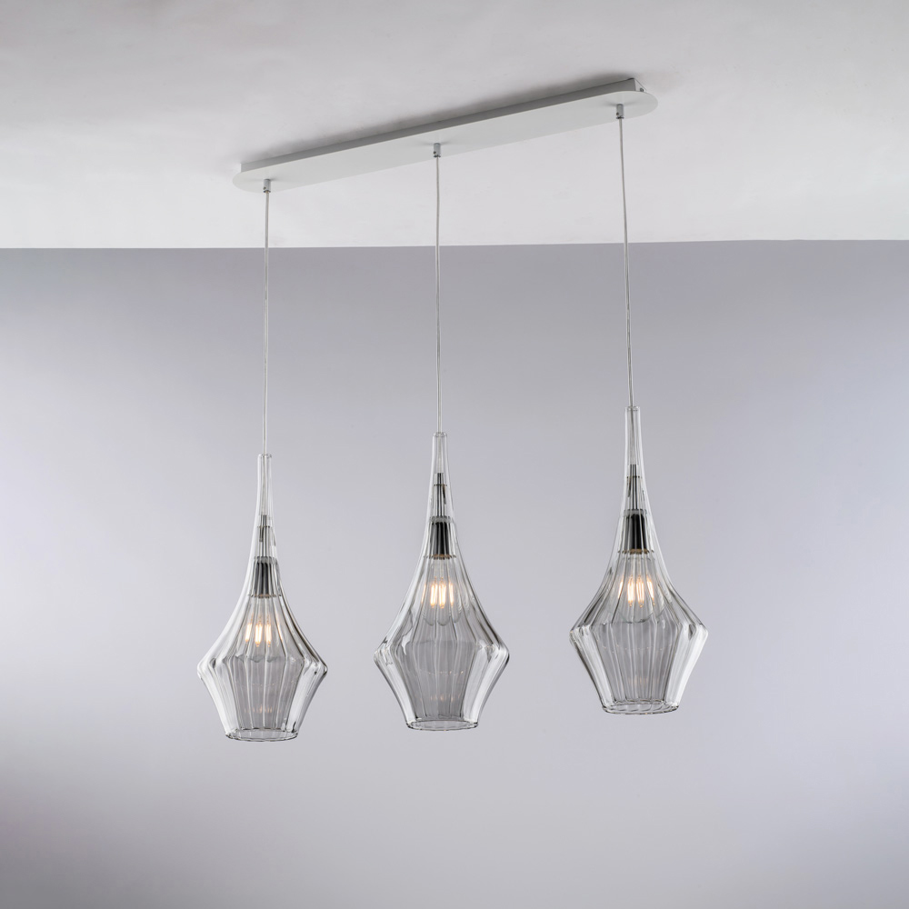 Toto ručně vyrobené železné závěsné svítidlo s pyrexovým sklem je moderním řešením osvětlení navrženým tak, aby prostor vylepšilo a doplnilo jeho vyvážeností a eleganci. Tři difuzory z pyrexového skla s fazetovanými a harmonickými tvary rovnoměrně rozptylují světlo a vytvářejí zářivou a sofistikovanou atmosféru.