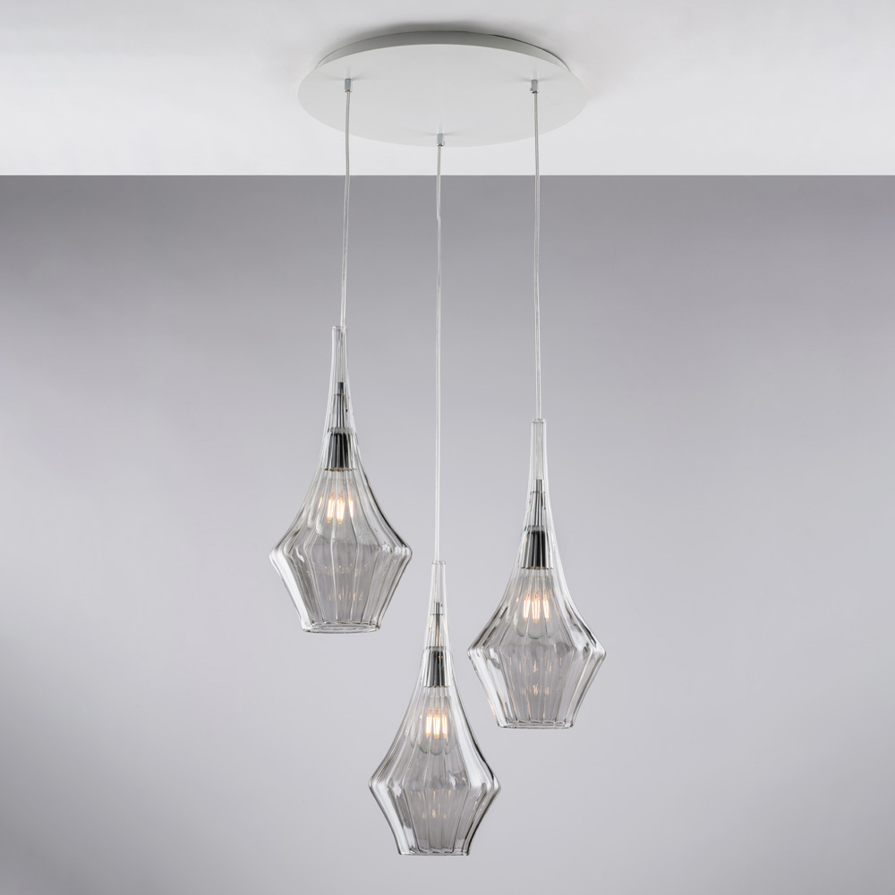 Toto závěsné svítidlo, které je k dispozici v průhledné , jantarové nebo šedé povrchové úpravě, vám umožní přizpůsobit si atmosféru vašeho prostoru: v průhledné verzi bude světlé a vzdušné, v jantarové hřejivé a obklopující, v šedé moderní a elegantní. Je ideální do obývacích pokojů , jídelen , kuchyňských ostrůvků , otevřených prostor a designových interiérů .
