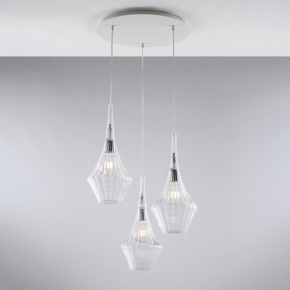 Toto elegantní a zářivé, ručně vyrobené železné závěsné svítidlo s pyrexovým sklem je osvětlovacím řešením s moderním a rafinovaným vzhledem. Tři difuzory z pyrexového skla s geometrickými a fazetovanými tvary harmonicky rozptylují světlo a vytvářejí lehký a sofistikovaný vizuální efekt.