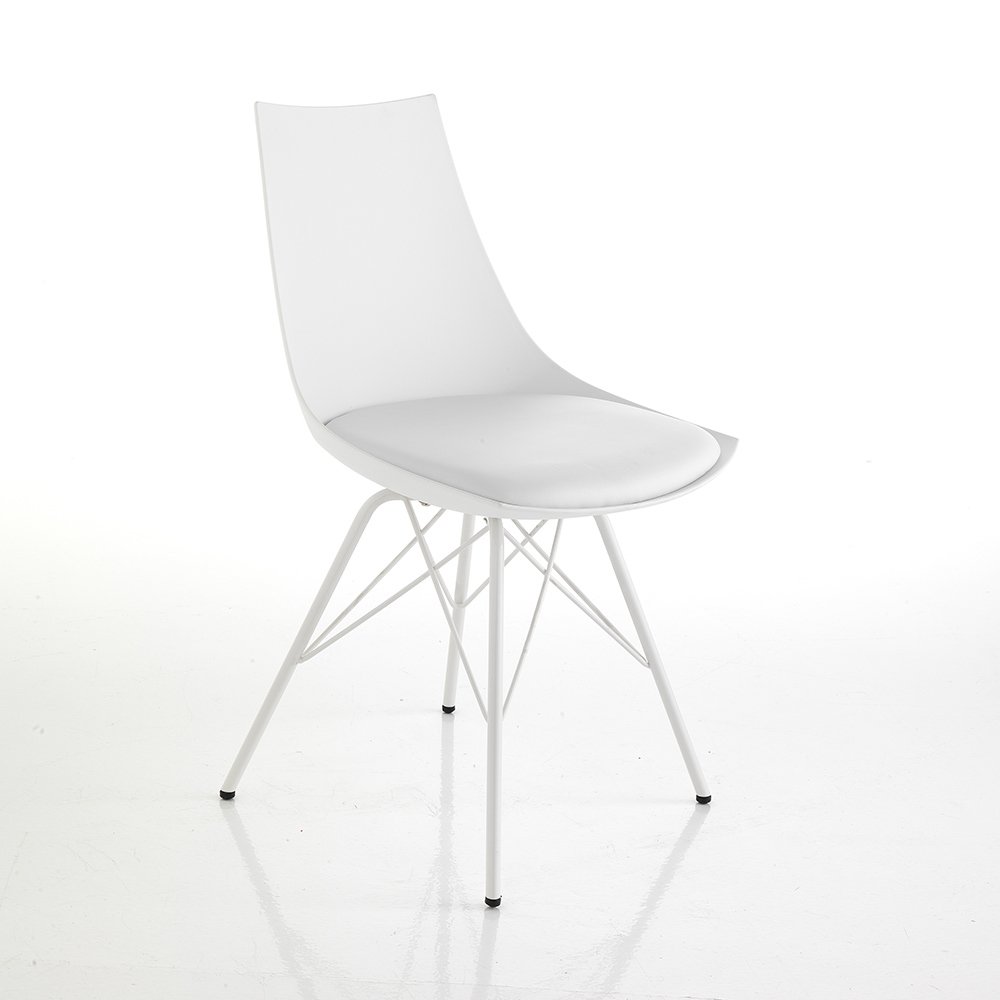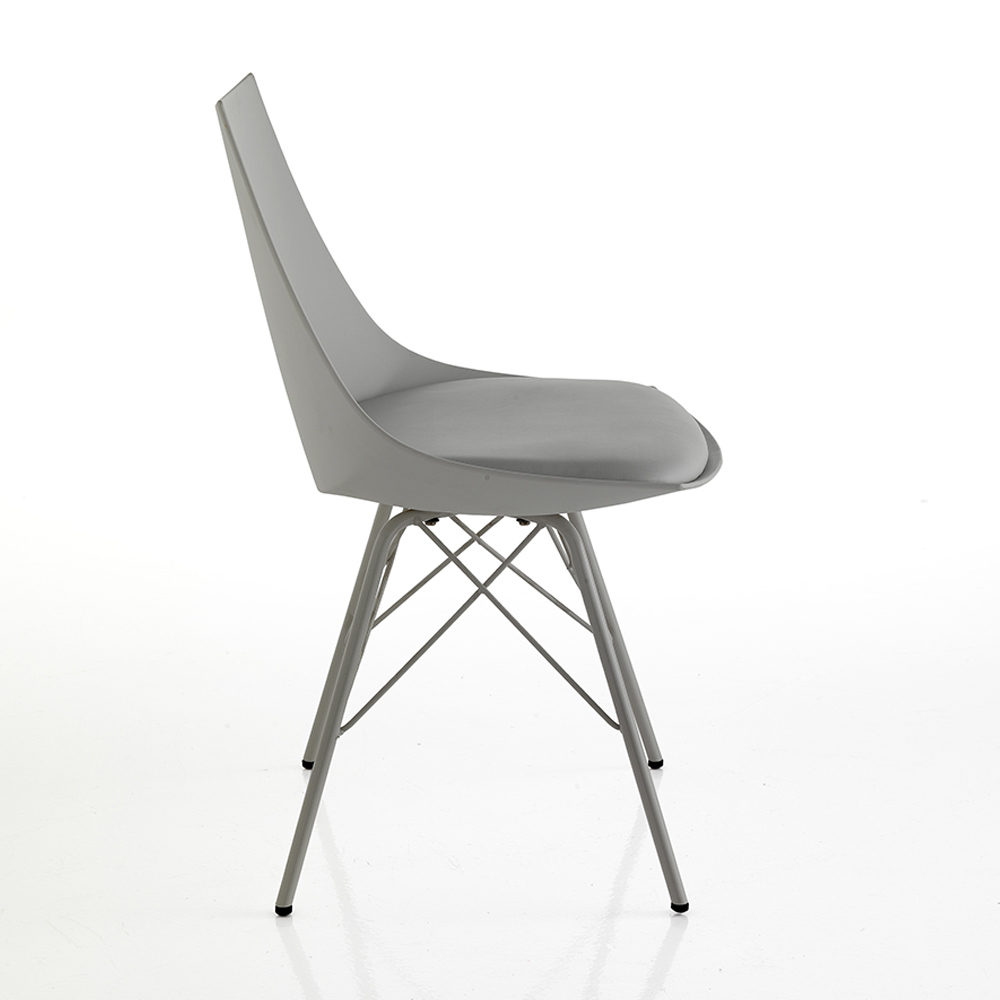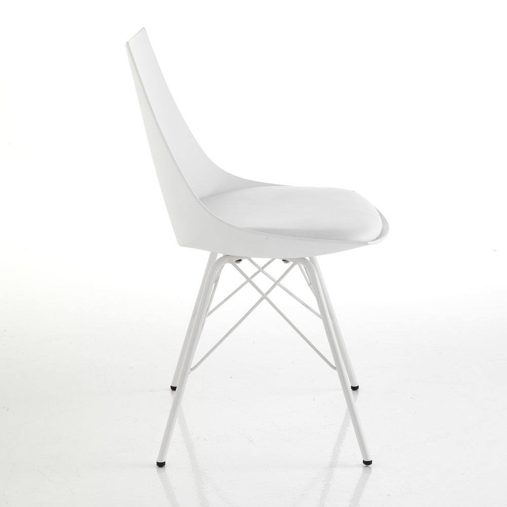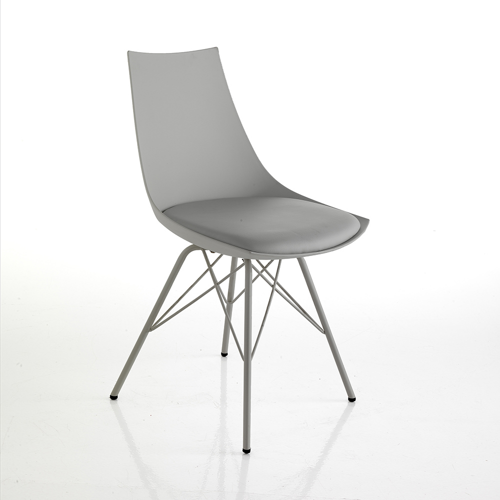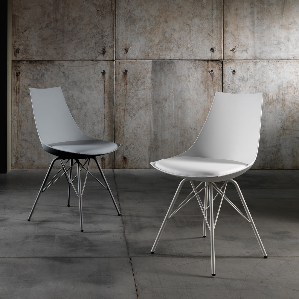 Židle do jídelny nebo kuchyně s konstrukcí z lesklého lakovaného kovu , skořepinou z neprůhledného polypropylenu a polstrovaným sedákem potaženým syntetickou kůží . Doplněk s inovativním a vytříbeným designem, ideální pro moderní vybavení, které vyžaduje dotek osobnosti .