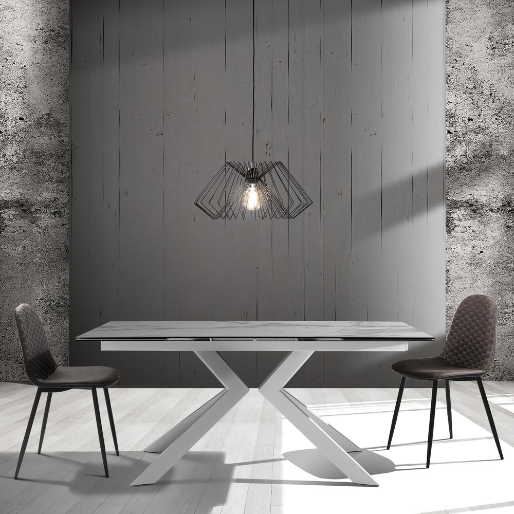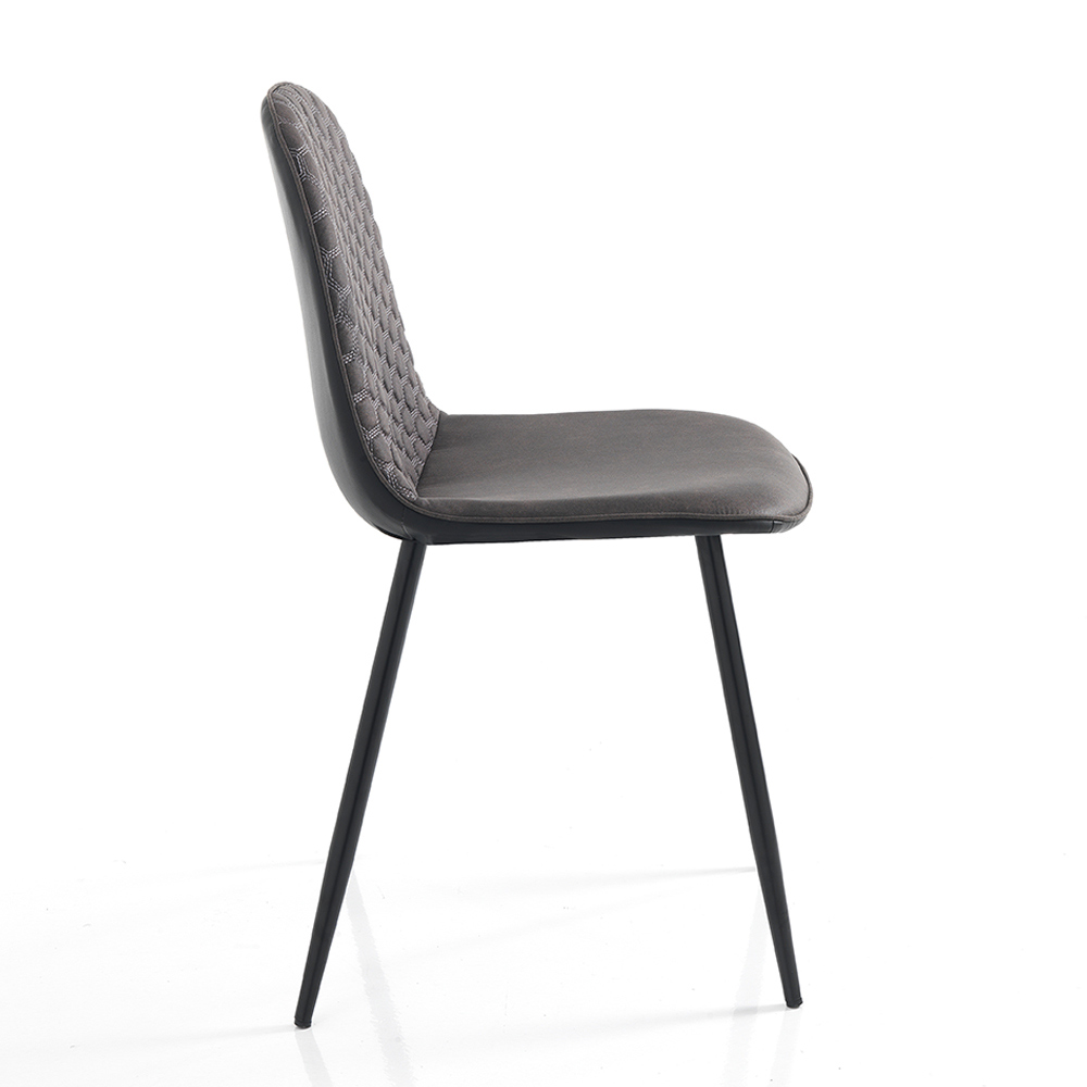 Jídelní židle čalouněná tkaninou z mikrovlákna se sametovým efektem a černým opěradlem ze syntetické kůže a matnou černou lakovanou kovovou konstrukcí. K obohacení jednoduché estetiky židle slouží