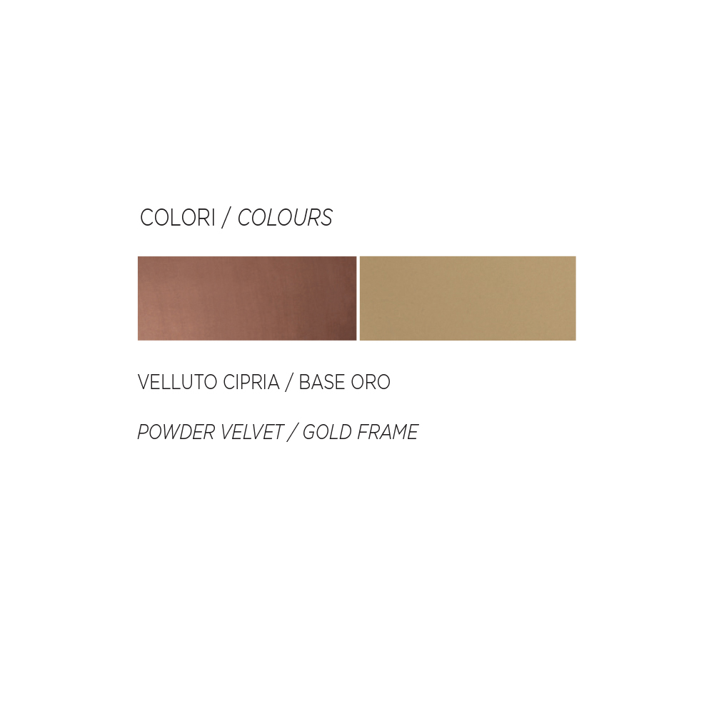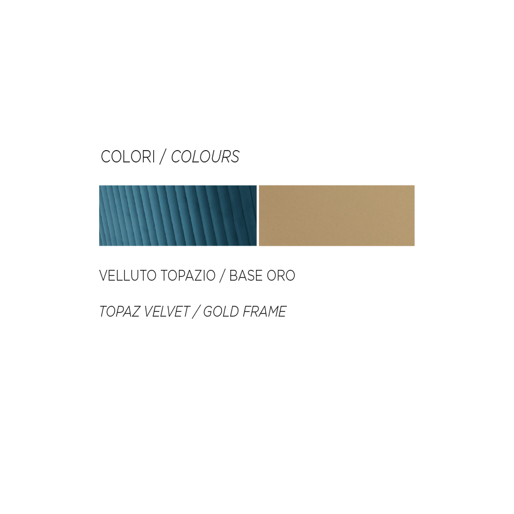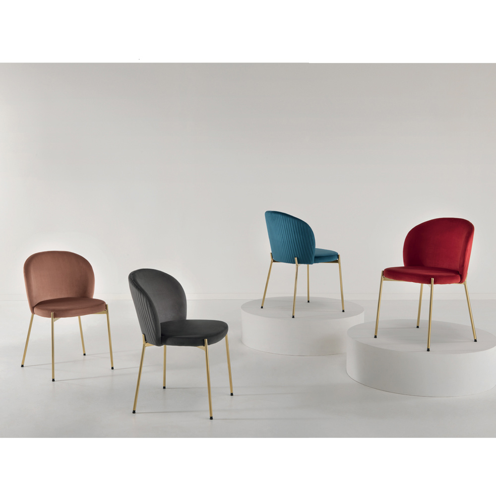 Židle do obývacího pokoje s polstrovaným sedákem potaženým sametovou a zlatou kovovou konstrukcí. Kus nábytku se základním stylem přepracovaným v současném klíči, aby oživil originální sedadlo díky kombinaci moderních a inovativních materiálů a barev . Výsledkem je jedinečné řešení zařízení, které spojuje funkčnost a všestrannost a vybaví vaše domácí prostory osobitostí.